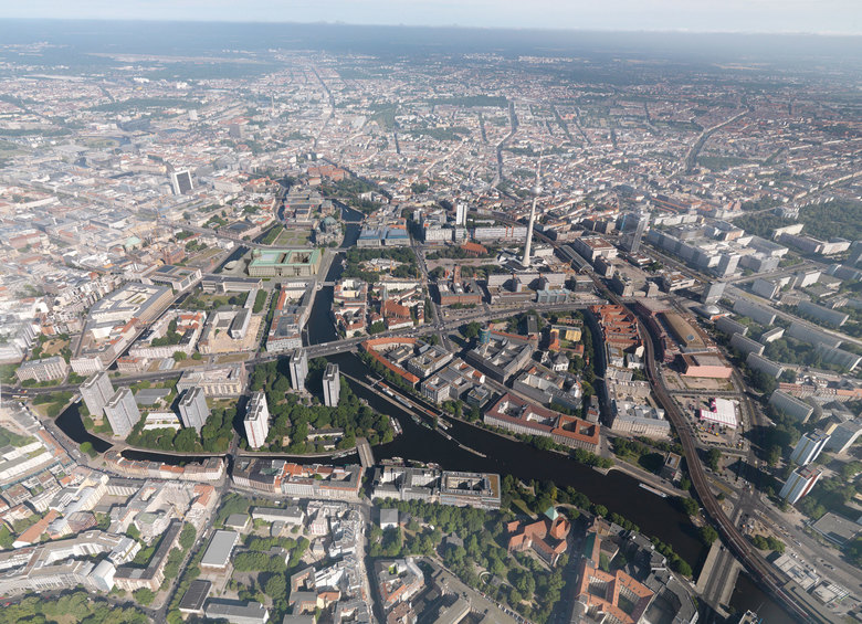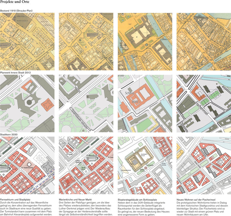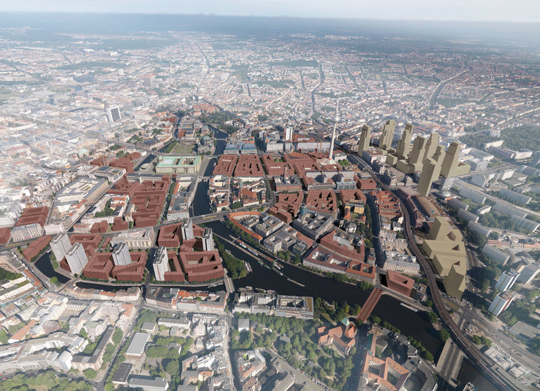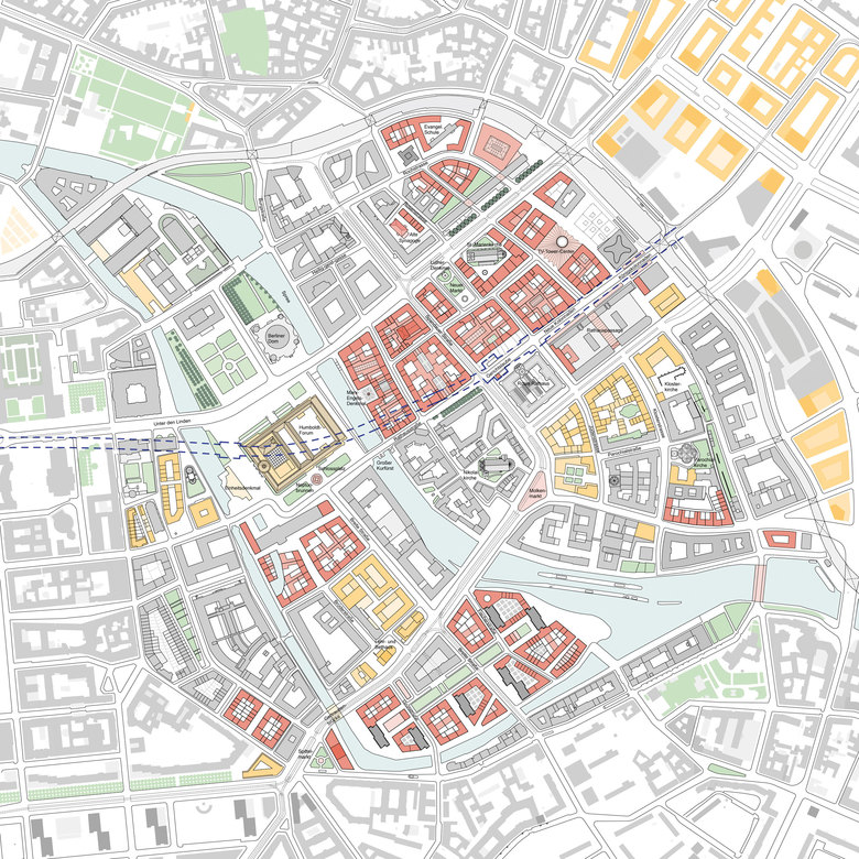 25 Jahre nach dem Mauerfall und dem Ende der Teilung Berlins erscheint auch heute noch der Berliner Stadtkern wie ein Freilichtmuseum der ehemaligen DDR-Hauptstadt, mit nur wenigen Ausnahmen. Dass sich mit dem Bau des Humboldt-Forums nun auch eine städtebauliche Wende andeutet ist bereits körperlich zu spüren, die Gravitation der Mitte Berlins wird sich dramatisch verändern. Um den abstrakten und in weiten Teilen redundanten Debatten über die Zukunft des Berliner Stadtkerns eine konkrete städtebauliche Vorstellung zur Seite zu stellen, haben wir unseren Entwurf von 2009 für die 2014 bei DOM publishers erscheinende Neuauflage des Buches Berliner Altstadt erweitert und überarbeitet und mit dem Titel Stadtkern 2030 auf den neuesten Stand unserer Überlegungen gebracht.