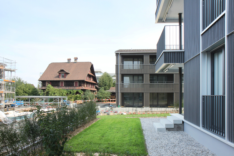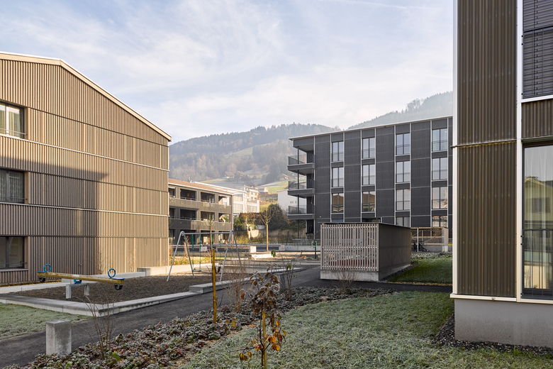 Die Wohnüberbauung der Baugenossenschaft Pro Familia Root liegt im historischen Dorfzentrum und grenzt unmittelbar an das denkmalgeschützte Gasthaus Rössli. Vier kompakte, mehrgeschossige Wohnbauten bauen die Massstäblichkeit der Dorfstruktur weiter und verbinden sich über eine Gartenlandschaft mit den umliegenden Holzbauten. In Gestaltung, Materialisierung und Grundriss ist jedes Gebäude individuell gestaltet – mal in Anlehnung an die umliegenden Bauten mit Satteldach und Holzfassade, mal verfremdet mit Flachdach und fein profilierter Metallfassade. Die zueinander versetzte Positionierung der Gebäude ermöglicht vielfältige Sichtbezüge und spezifische Aussenräume mit Gartenflächen und Spielplätzen als Begegnungsorte für Jung und Alt. Das Quartier ist autofrei, die Anbindung erfolgt über eine gemeinsame Tiefgarage mit Einfahrt beim Spittelweg. In den Flachdachhäusern verteilen sich sechzehn 4.5-Zi-Familienwohnungen, in den Satteldachhäusern befinden sich fünfzehn 2.5- bis 3.5-Zi-Alterswohnungen mit einer gemeinschaftlich nutzbaren Laube und einem Gemeinschaftsraum als Orte des gemütlichen Beisammenseins. Das Projekt verdichtet das Dorfzentrum mit attraktiven Genossenschaftswohnungen und lässt mit seiner leicht terrassierten Gartenlandschaft ein ortstypisches Element wieder aufleben.