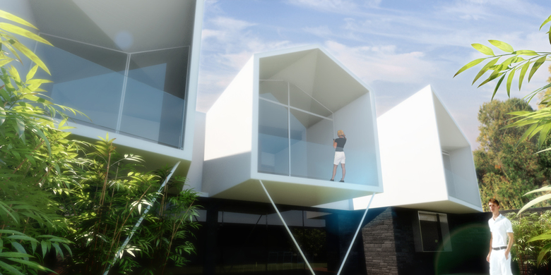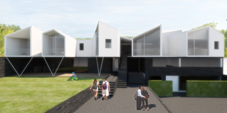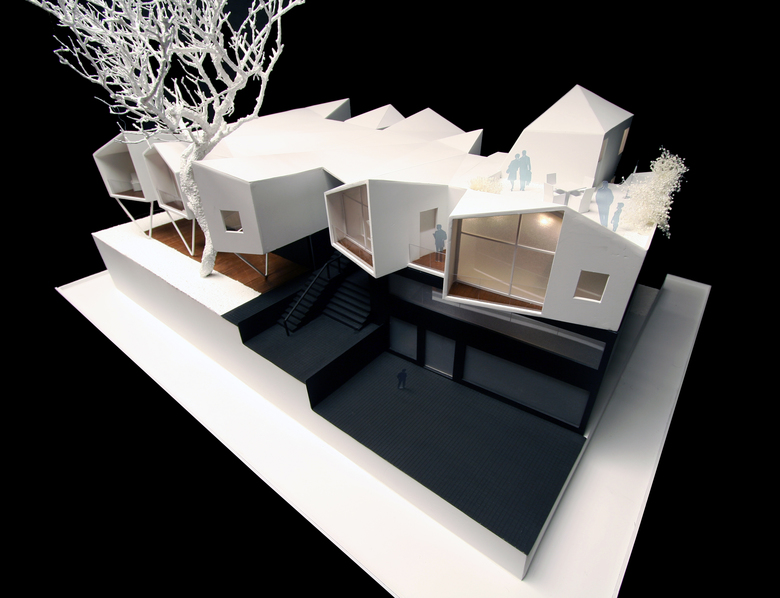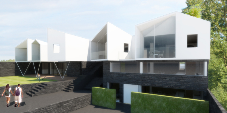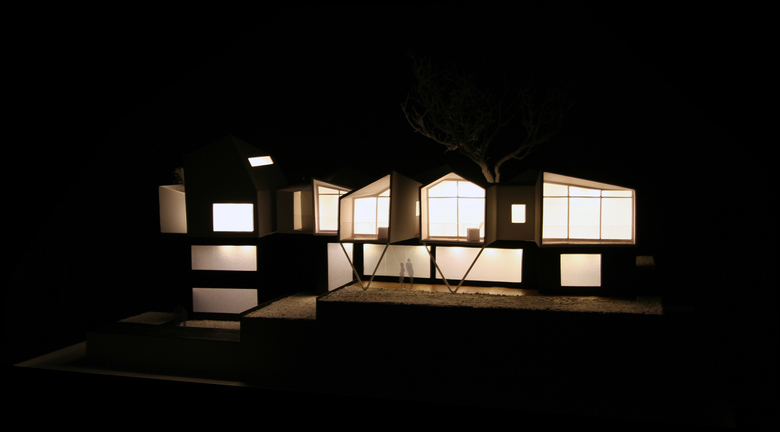 The program required that the father’s two apartments be restricted to his plot and the remaining three to the other. It also asked that they have the appearance of a uniform project but function as two separate and independent buildings. All the apartments would share the common garden.