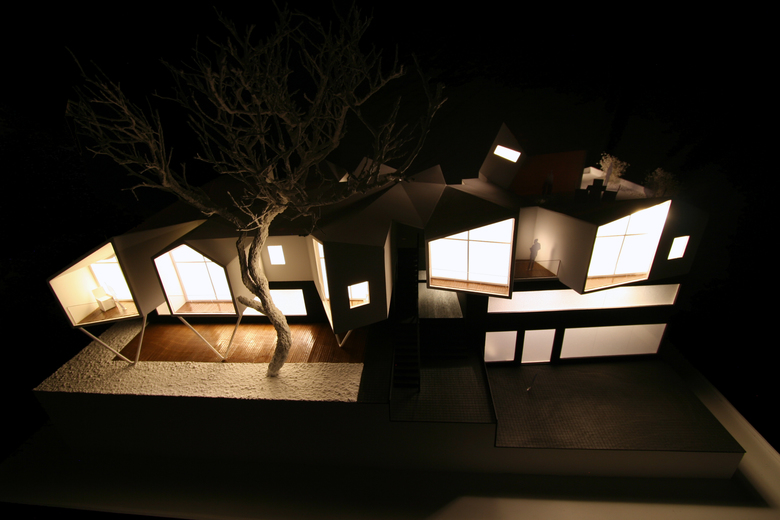 In order to alter the volume’s boring flatness and mimic the mountains lying in the background, the vertices were raised randomly to produce a wrinkled surface that unites the two buildings.