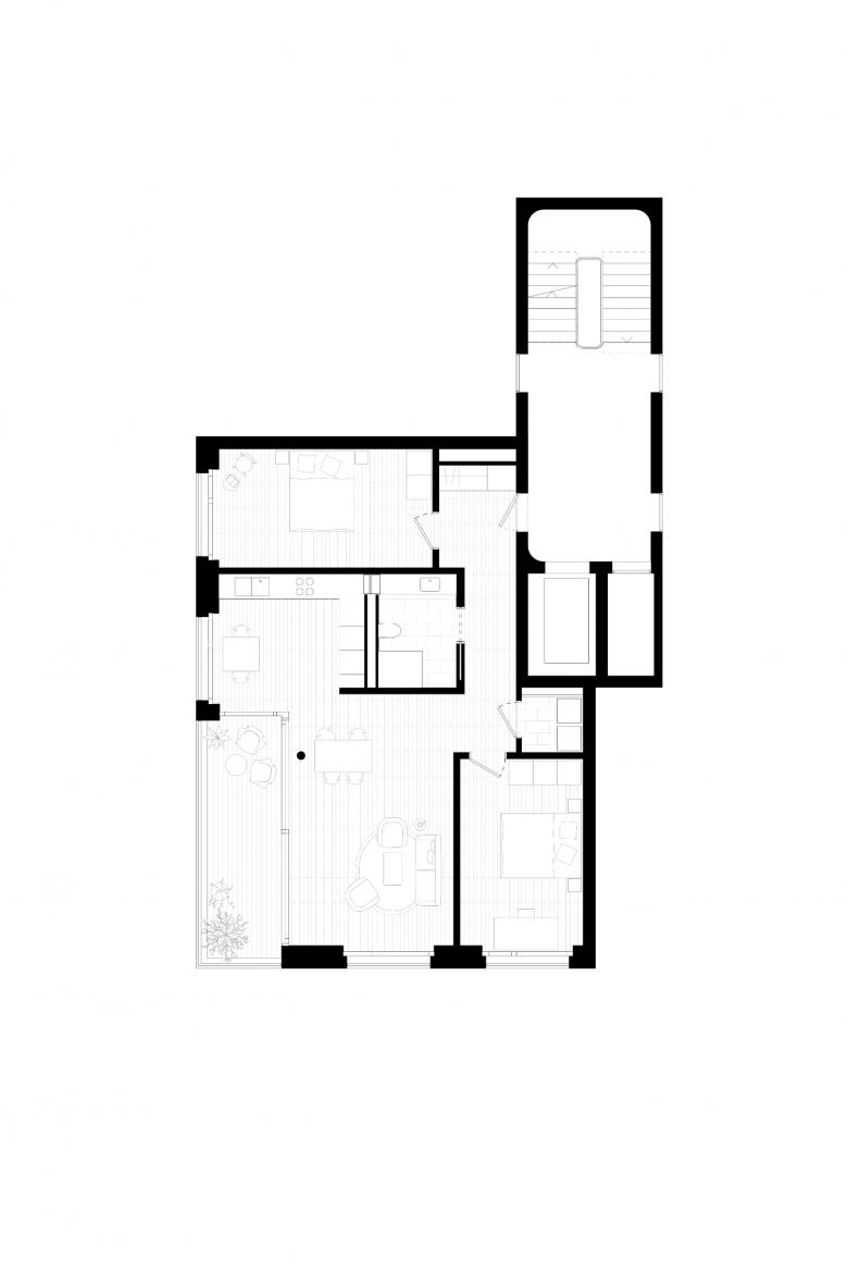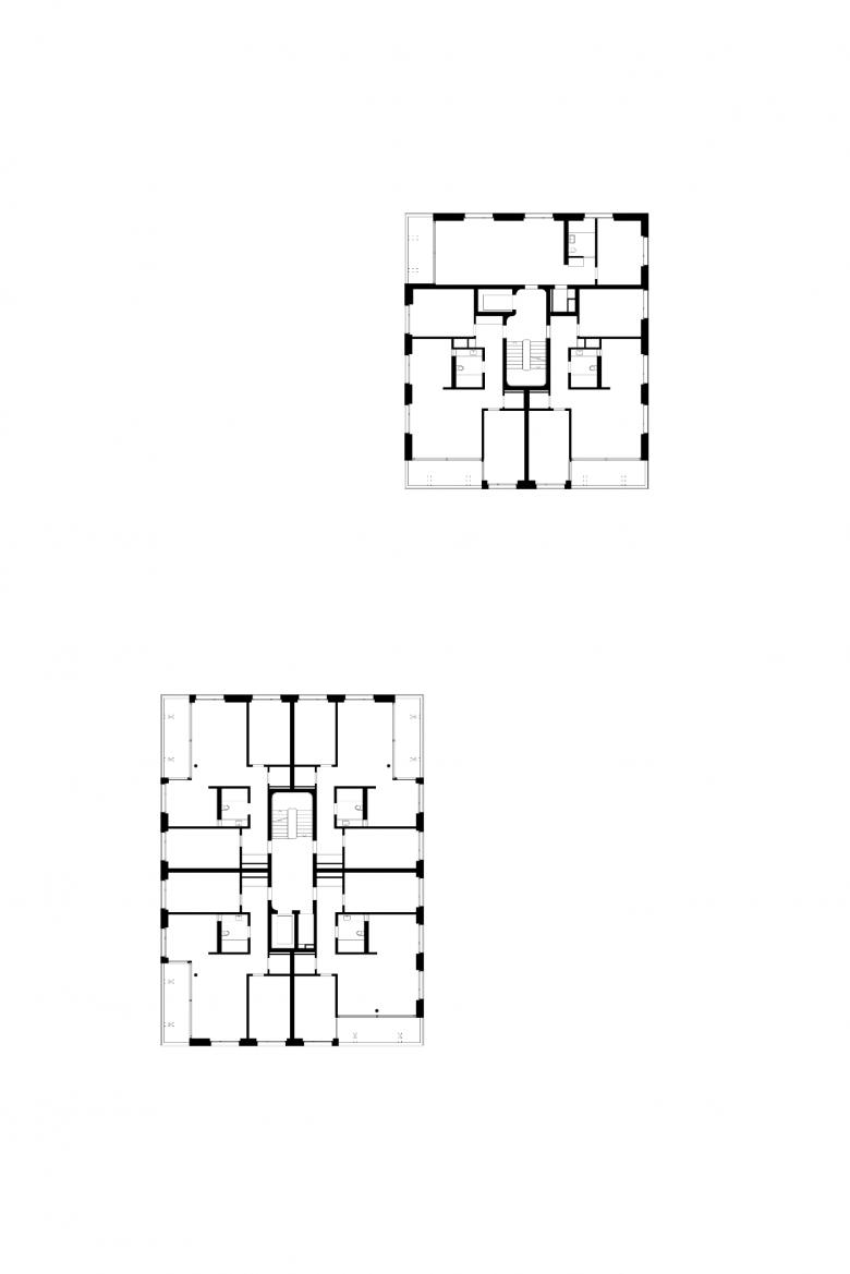 Bei beiden Häusern werden über ein innenliegendes Treppenhaus vier Wohnungen pro Geschoss erschlossen, die alle von zwei