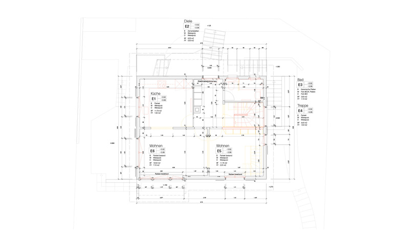 Die zentrale Aufgabe bestand darin, aus den zwei kleinen Geschosswohnungen ein Einfamilienhaus mit einer internen Treppe zu realisieren. Zusätzlich wurden die Räume im Wohngeschoss mittels Durchbrüchen grosszügiger gestaltet und auch die Fenster, neben der internen Treppe, der Küche und allen Nasszellen komplett neu erstellt. Die Materialisierung besteht aus einer Mischung alter Fischgrätparkettböden, Schreinerarbeiten sowie neuen Boden- und Wandbelägen.