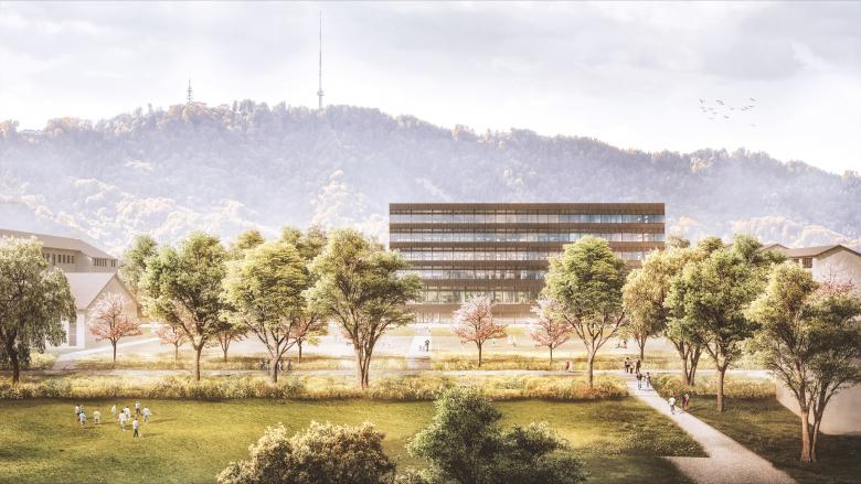 Ersatzneubau mit 18 Klassenzimmern als Tagesschule, Bibliothek / Mediathek, Mensa, Mehrzweckraum / Singsaal, Musikschule, Doppelturnhalle mit Nebenräumen für Schul- und Vereinssport, Schulschwimmanlage, Pausen- und Sportplätze