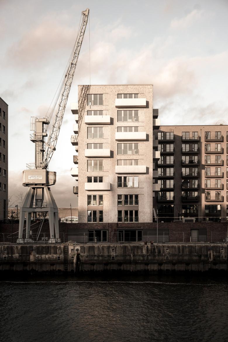 Das Ergebnis eines hochbaulichen Realisierungswettbewerbs bildet die Grundlage für die Blockrandbebauung im östlichen Teil der HafenCity Hamburg. In doppelter Wasserlage an der Elbe liegt das 24 ha große Quartier Neuhavn, auf dem unterschiedliche Wohnungstypologien, Büro- und Gastronomieflächen realisiert werden. Das städtebauliche Umfeld ist geprägt durch die Wasserlage sowie die Nähe zum Liselotte-von-Rantzau-Park und den U-Bahnhöfen HafenCity Universität und Elbbrücken. Das von DFZ realisierte Baufeld 84a besteht aus insgesamt drei Gebäudeteilen: Das siebengeschossige Haus 1 liegt orthogonal zwischen Hafenbecken und Bahntrasse. Neben 32 frei finanzierten Wohnungen befinden sich hier zwei zum Wasser ausgerichtete Townhouses sowie die Räumlichkeiten der Loki Schmidt Stiftung. Letztere beherbergt neben den Büroräumen, eine Galerieebene sowie eine Ausstellungsfläche im Warftgeschoss mit Zugang zur Uferpromenade. In den parallel zur Versmannstraße ausgerichteten Baukörpern (Haus 2+3) befinden sich neben den 62 geförderten Wohnungen, Büroflächen sowie ein Café im Erdgeschoss. Das äußere Erscheinungsbild des Ensembles wird durch eine Riemchenfassade im Sonderformat geprägt. Die Fassade von Haus 1 ist mit einem schmalen Klinkerriemchen im Hochformat versehen, das die vertikale Ausrichtung des Gebäudes betont. Bei den Häusern 2+3 kommt ein quadratisches Riemchenformat zum Einsatz, das im Erdgeschoss und im Bereich der Fensterflächen durch vor- und rückspringende Steinreihen akzentuiert wird. In Kombination mit den dunklen Metallbauteilen und den Glasflächen tritt der helle Klinker deutlich in den Vordergrund. Das Gesamtkonzept verbindet klare architektonische Stringenz mit einer differenzierten Materialwahl und Fassadengestaltung, die die unterschiedlichen Nutzungen ablesbar macht und das Erscheinungsbild prägt. Die Häuser 2+3 werden unter Berücksichtigung der Förderrichtlinien der IFB realisiert. Das Projekt ist mit dem HafenCity Umweltzeichen Platin ausgezeichnet.