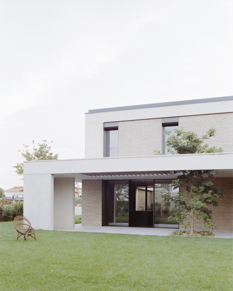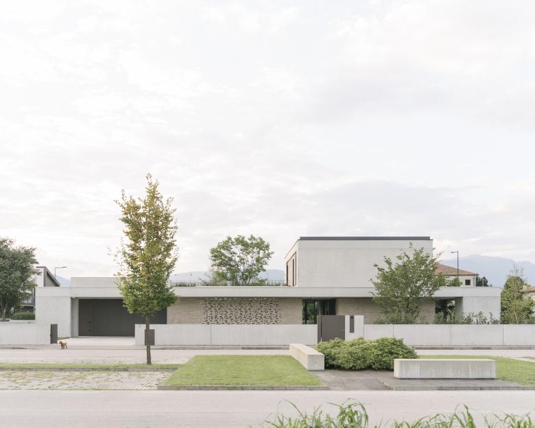 Progetto per una nuova abitazione in un quartiere residenziale nei pressi di Bassano del Grappa. L’edificio è composto da una grande “piastra” che racchiude gli spazi interni e li protegge dagli sguardi con l’utilizzo di patii verdi e membrane più o meno permeabili in laterizio. Al di sopra di essa vi sono due volumi che completano la parte sommitale dell’edificio, quello più grande contiene la zona notte, mentre quello più piccolo cinge una terrazza solarium raggiungibile dalla zona notte.