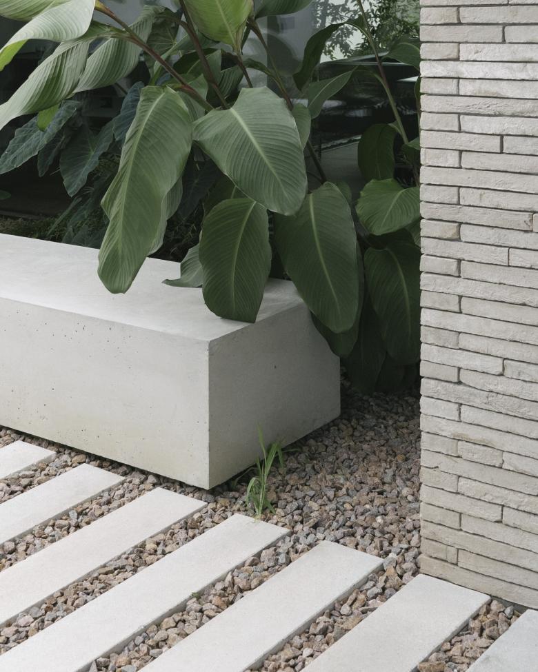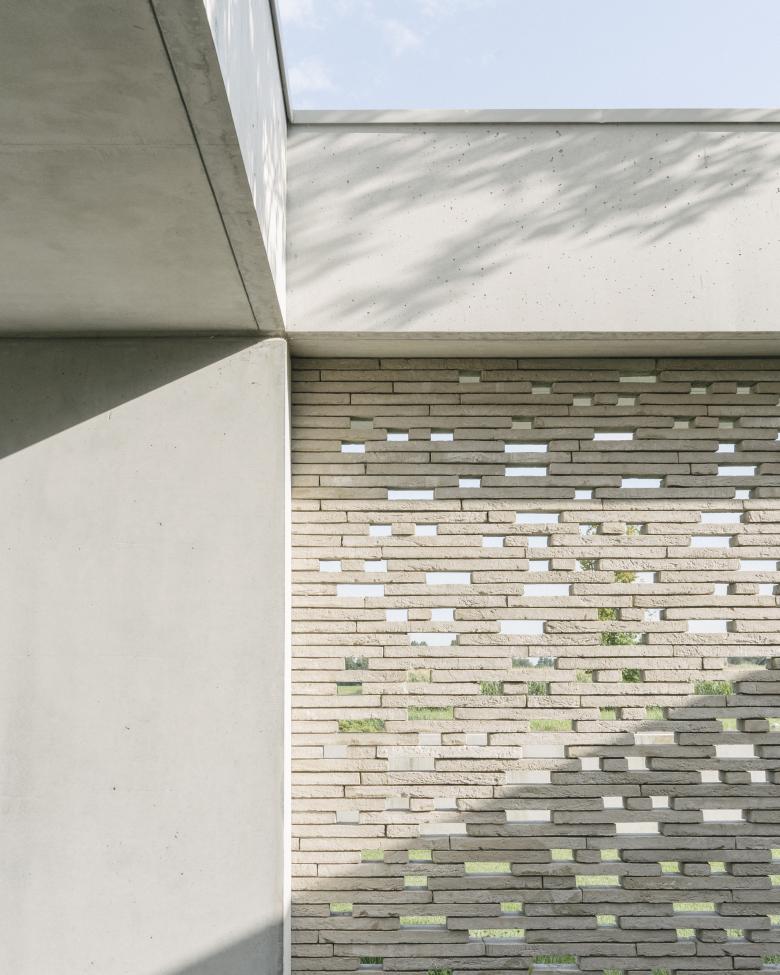 I materiali utilizzati nel progetto sono pochi ma importanti. I corpi principali della casa sono in calcestruzzo grigio liscio. A piano terra, tra gli appoggi, i muri appaiono in mattoni chiari di grande formato, posati quasi a secco e sono interrotti dai fori contornati da imbotti metallici color brun. I serramenti sono stati disegnati per mostrare solo il vetro nelle parti fisse, e lasciare la lettura solo delle porzioni apribili. A piano primo, nei lati est e ovest, viene ripresa questa alternanza di materiali tra le finestre delle camere.