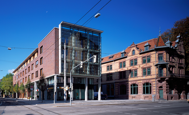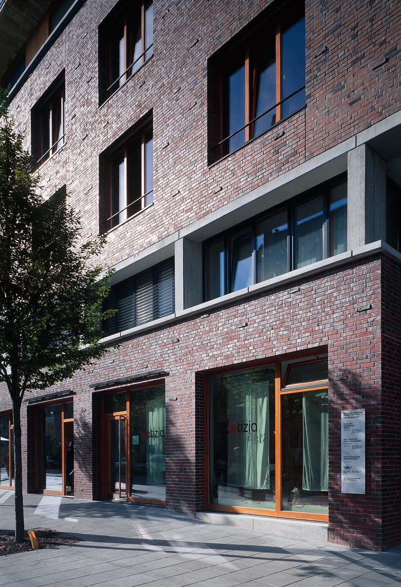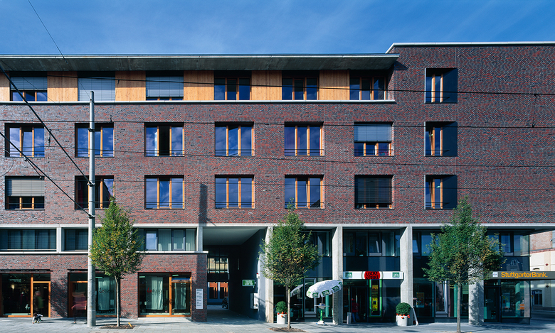 In beengter innerstädtischer Lage, zwischen Steilhang und Hauptverkehrsstraße wurde unter Einbezug eines denkmalgeschützten ehemaligen Brauereigebäudes ein vielfältiger Gebäudekomplex für unterschiedlichste Nutzungen entwickelt. In den zwei Neubauteilen, die eine öffentliche Straße überspannen und die Quartiersecke mit einer großen Verglasung markieren, sind 72 Pflegeplätze für alte und junge Menschen, eine Sozialstation, mehrere Läden und eine Bankfiliale, Arztpraxen, Büros und einige Wohnungen untergebracht. Der renovierte Altbau beherbergt ein Stadtteilzentrum, mehrere Vereinsräume, einige Appartements und – im ehemaligen Tanzsaal der Brauereigaststätte – ein Restaurant, das sich in den terrassierten historischen Biergarten mit schönem Baumbestand öffnet. Torfbrand-Klinker am Neubau stellen auch äußerlich die Integration von altem und neuem Bauen her.