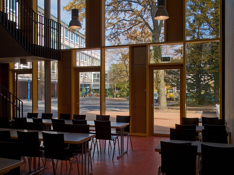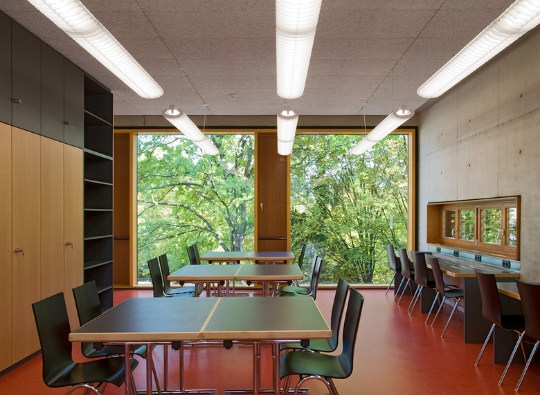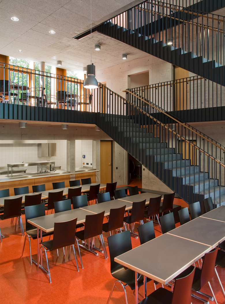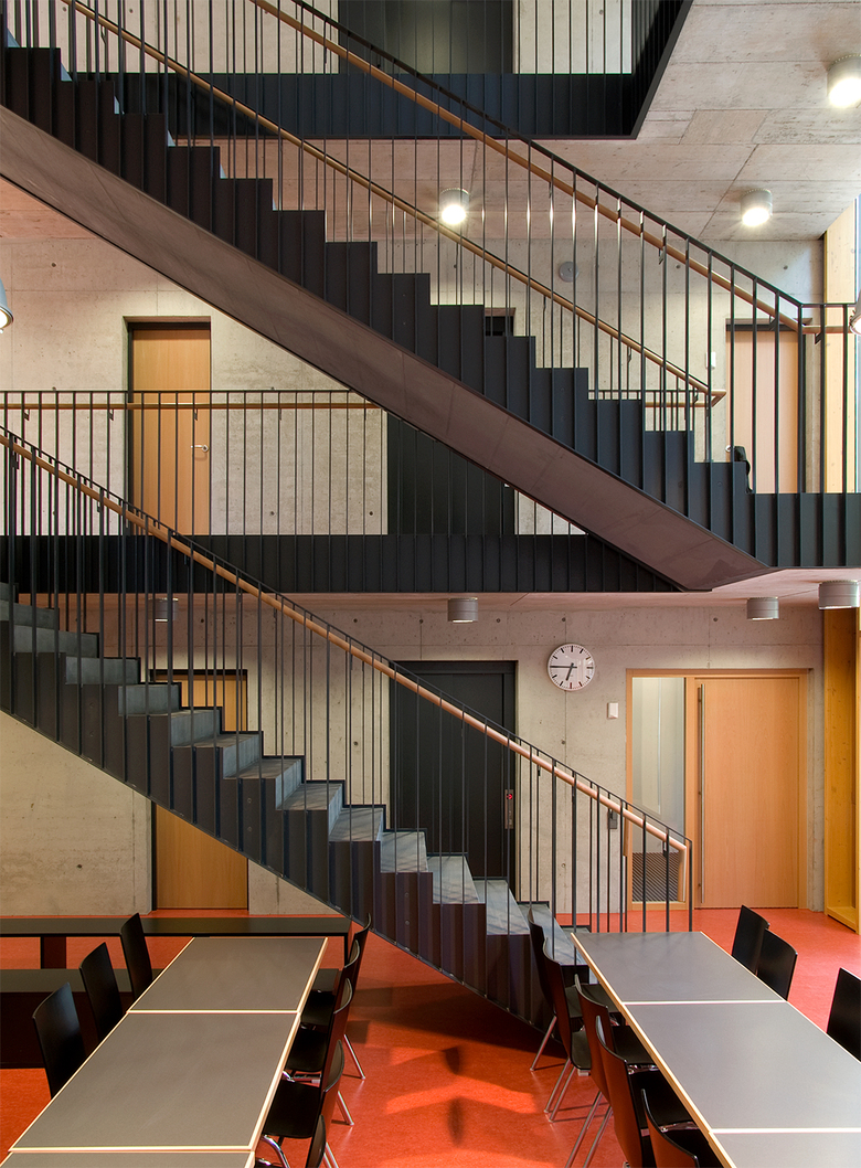 An der Nahtstelle zwischen zwei höhenversetzten Pausenhöfen ist das Schülerhaus als leicht gedrehter Solitär eingestellt. Die Form des Würfels steht in spannungsreichem Gegensatz zum langgestreckten Baukörper des Schulhauses. Die eigenständige Bauform unterstreicht die unabhängige Nutzung des Schülerhauses, das als temporäres Zuhause für Schüler gesehen wird, die ganztags auf dem Schulgelände leben, arbeiten und ihre Freizeit verbringen. Drei Ebenen bilden die drei Funktionen des Hauses ab: Mittagstisch unten, Chillen in der Mitte, Hausaufgaben oben, verbunden durch eine offene Treppe. Wände und Decken sind in Sichtbeton ausgeführt, die Außenwände mit horizontalen Holzlattung geschützt. Geschossübergreifenden Verglasungen öffnen sich zu den beiden Pausenhöfen. Dank rigoroser Beschränkung auf das Notwendigste konnte das knapp bemessene Baubudget eingehalten werden.