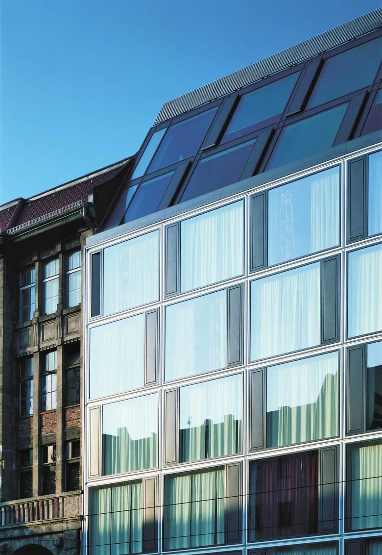 Die gläserne Stirnseite, das heißt die Fassade, macht den Gast einerseits zum Voyeur, anderseits zum Objekt des Alltags an der Mündung von Oranienburger Straße und Linienstraße. Pro Hotelzimmer erscheint eine feste Scheibe von 2,7 mal 2,7 Metern, neben ihr eine öffenbare Klappe von 0,5 Metern Breite. Die Öffnungsflügel sind, wie die Rahmen der Fenster, aus Aluminium; doch sind sie mit einer matten, anthrazitfarbenen Schicht versehen. Und sie springen – sowohl von Geschoss zu Geschoss als auch von Zimmer zu Zimmer – immer wieder von rechts nach links, von links nach rechts.