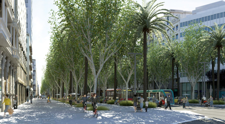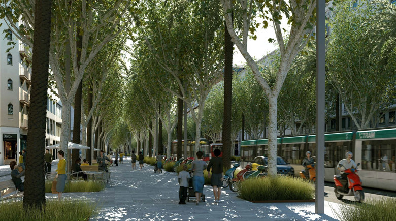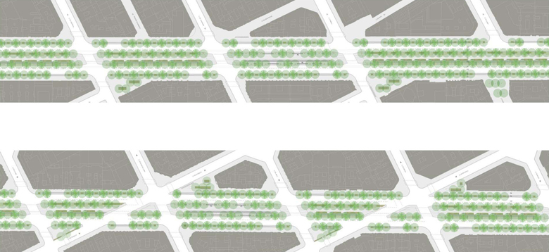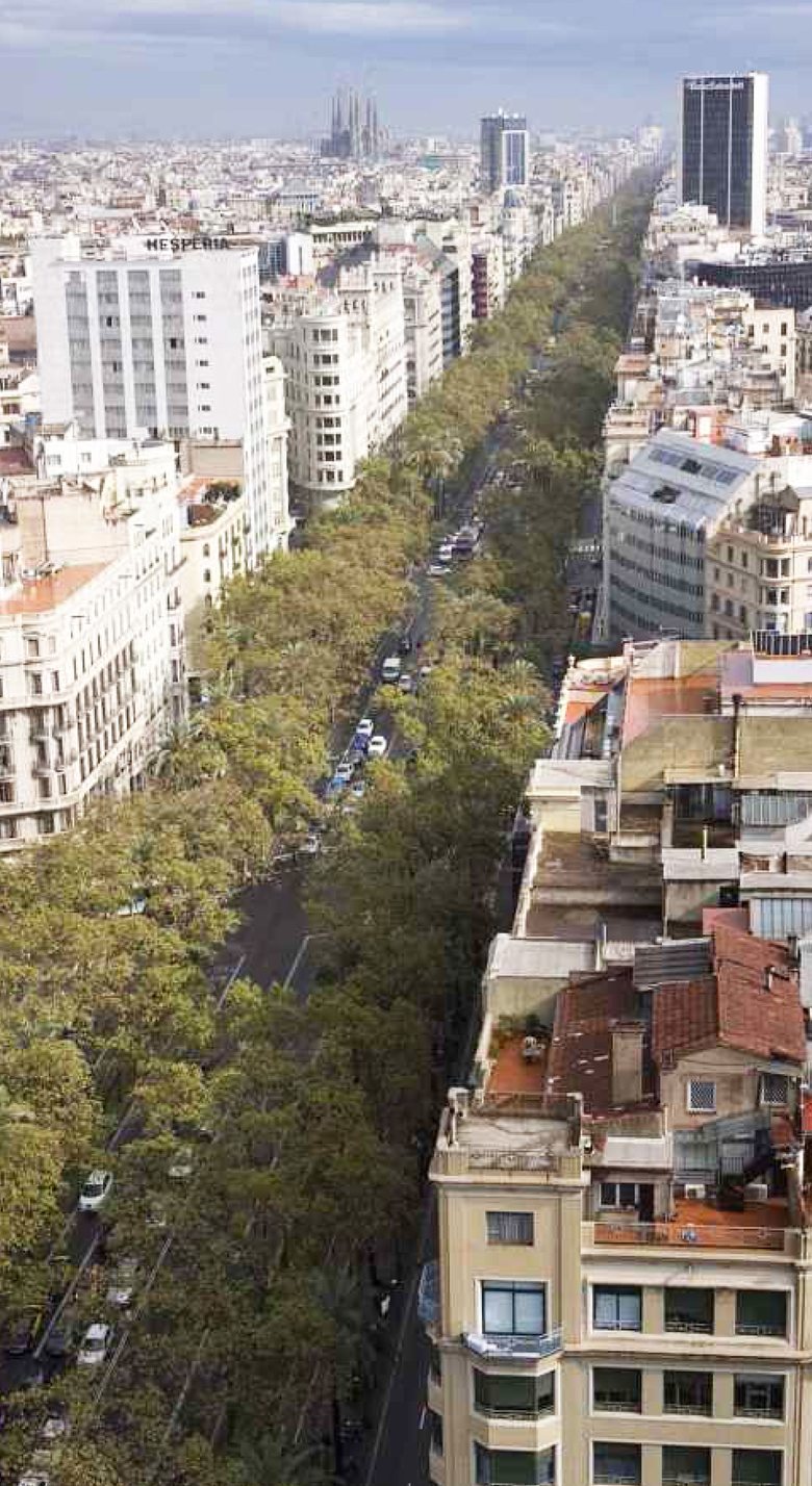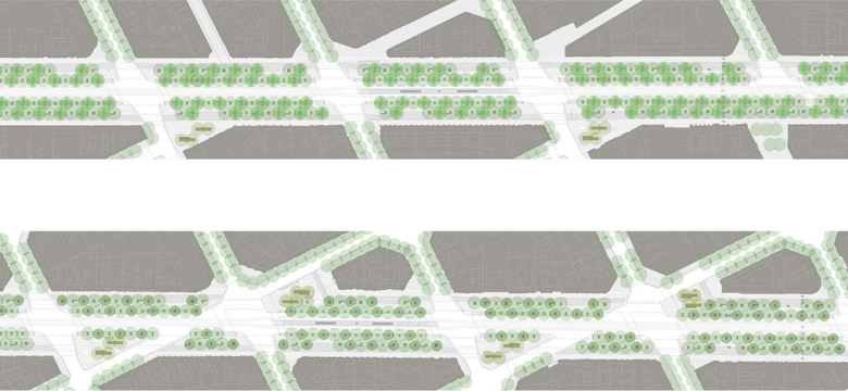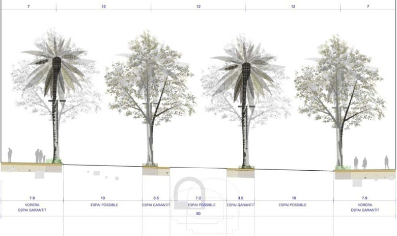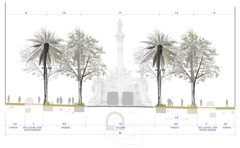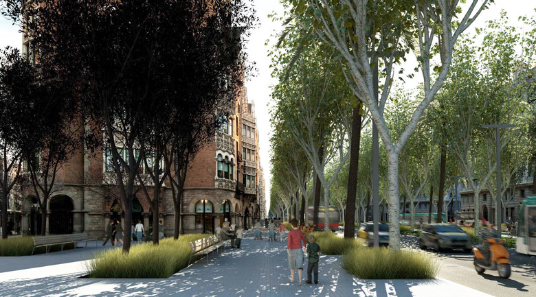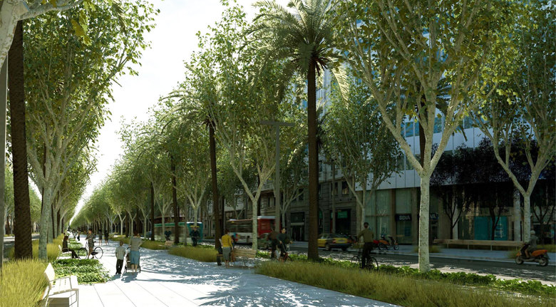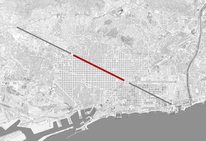 Desarrollo de dos propuestas para la reestructuración de la avenida, puesta en funcionamiento de la nueva línea de tranvía y diseño del espacio público sobre una longitud de 3,7 km. Conjuntamente con el Servicio de Urbanismo de la ciudad de Barcelona, Carme Ribas y Bernardo Sola. En 2008 el Ayuntamiento de Barcelona propone la transformación de la secuencia central de la avenida Diagonal como lugar de encuentro para las personas, eje estructurante de transporte público integrando una nueva línea de tranvía y lugar de referencia para toda la ciudad. El proyecto de espacio público debe afirmar los elementos que conforman los valores de axialidad, continuidad y unidad, al mismo tiempo que domine, con su propia morfología, la lógica de los diferentes sistemas que intervienen en el espacio urbano: usos, infraestructuras, gestiones, etc, no siempre coherentes entre ellos mismos. Ofreciendo soluciones para el aparcamiento y un transporte público eficaz a lo largo de toda la longitud de la avenida, esta intervención favorece la cohabitación entre todos sus usuarios y tiende a resolver los problemas de circulación y sobrecarga de la avenida. Se plantean dos opciones: Opción A: Bulevar La propuesta se basa en la morfología actual de la avenida, reorganizando los usos sin alterar el espíritu inicial de los paseos laterales y la circulación central. La posición actual de los árboles se conserva. Ésta opción configura un espacio de proporciones 1/2/1. La situación de los recorridos laterales favorece la continuidad peatonal a lo largo de la avenida. La franja central, reservada a la circulación, se acondicionará en plataforma para el transporte público con el tranvía y el bus en posición adecuada y una vía mixta para taxis y vehículos de servicio. Esta disposición garantiza la eficacia del transporte en común y la seguridad de los viandantes. Opción B: Rambla Esta opción modifica la morfología de la Diagonal a partir de los nuevos condicionantes funcionales. La vegetación se reorganiza según cuatro alineaciones equidistantes entre ellas y las fachadas de los edificios y se libera del condicionante impuesto por la conservación del arbolado existente, creando una explanada. La distancia de 12m entre los árboles facilita la organización de los usos: rambla con paseo central de 15m, calzadas de 9m y aceras de 8,50m. Sobre las calzadas circulan transporte en común, vehículos de servicio y transporte privado (aunque reducido). Las proporciones entre las diferentes bandas y la disposición de los árboles configuran un espacio único compartido por peatones, ciclistas y conductores garantizando tanto la continuidad longitudinal como la transversal.