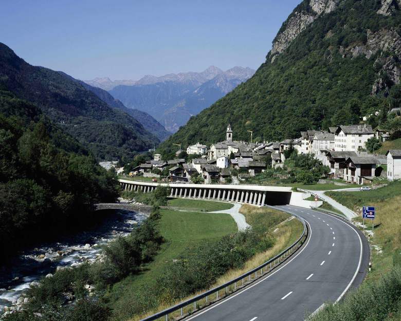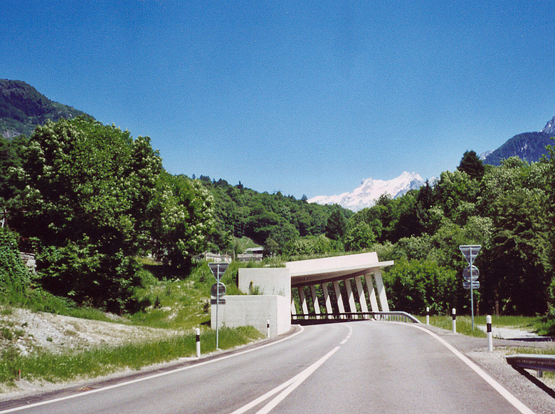 Das Grenzdorf Castasegna sollte mit einer in unmittelbarer Dorfnähe verlaufenden Umfahrung vom Durchgangsverkehr befreit werden, der bis dahin über die einspurige Dorfstrasse geführt wurde. Kernstück der Umfahrung bildet die ca. 300m lange Galerie. Das Erscheinungsbild in sehr hellem Beton gehaltenen Galerie wird geprägt von der S-förmigen Linienführung, der um 5:1 geneigten Stützen sowie dem ebenso geneigten Randträger mit einem feinen Vordach. Der Autofahrer erlebt die Galerie als transparente, dynamische Konstruktion.