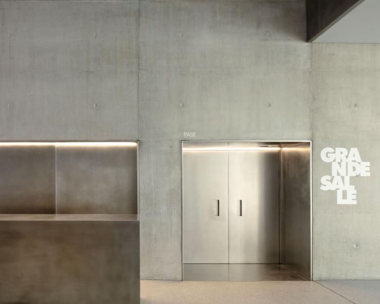 The lobby space, generous and transparent, creates links between the inside and the outside, and expresses the theater's opening to the city. The crossing foyer gives access to the two halls, and creates another link between the two public spaces that surround the building.