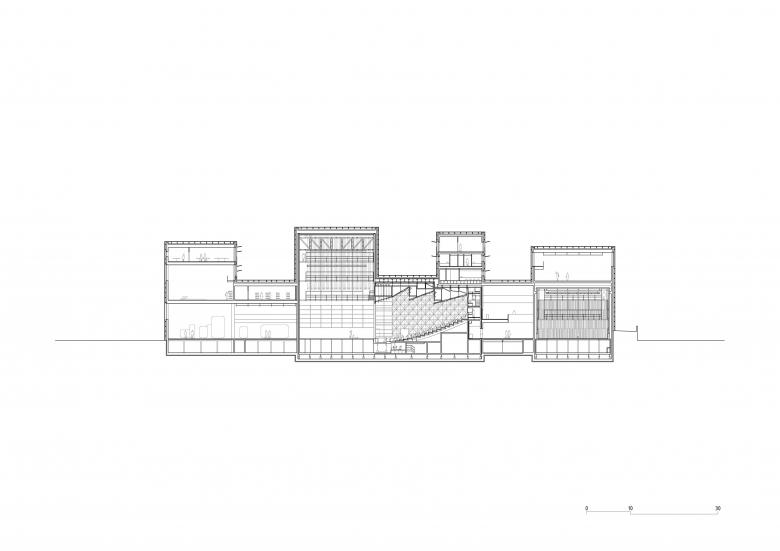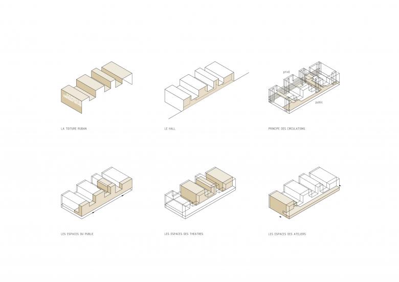 The project places the performance halls at the heart of the volume, with an articulation of the programs that generates a unique cross-section, thus giving the building its identity. Circulation spaces, public and private, are located on the façades surrounding the programs to which they give access.