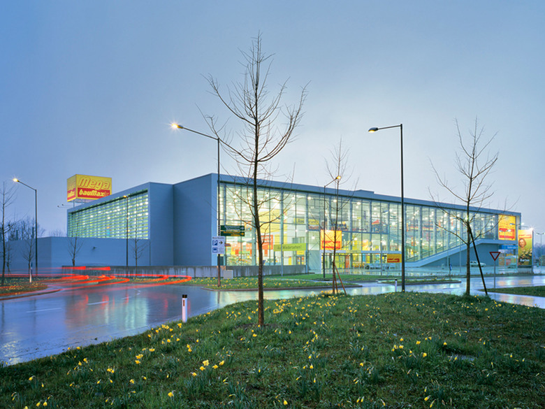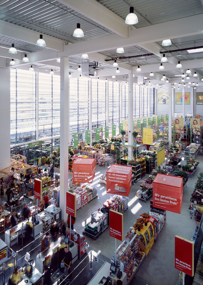 Eine große Handelskette wie Baumax betreibt professionelle Kundenerforschung und plant in eigenen Abteilungen Abläufe und Warenpräsentation bis ins kleinste Detail, wie Lagerregalmillimeter und Schriftart der Preisschilder. Der Handlungsspielraum der Architekten ist im Innenleben eingeschränkt. Auf die große Form, Struktur, Erschließung und Ausrichtung des Gebäudes bleibt die Konzentration gerichtet, über die Gestaltung eines Restaurantbereiches zum Beispiel, muss man sich keine Gedanken machen, das ist anderen überlassen. Die verglasten, offenen, freundlichen Seiten im Süden und Osten schauen zur Stadt. Geschlossen, aufgeräumt, mit Fassaden aus Blech stehen die übrigen Fronten zur Autobahn. Im Baumarkt, der jeden Zentimeter nutzt um den Patchworkteppich des Produkte-Sammelsuriums auszubreiten, ist Orientierung und Raumempfinden wesentlich. Über den doppelläufigen Rollsteig entlang der Glasfassade ist die imposante Größe des Bauwerkes zu erfassen und erleben. Großzügig wirkt auch der zweigeschossige Teil des Gartencenters im Süden. Die übrigen Abteilungen -Schwerlastabteilung im EG, Werkzeuge und Raumausstattung im OG - sind einstöckig. Wer in den Regalschluchten verloren zu gehen droht, orientiert sich nach dem Lichteinfall. Bei der Betonfertigteilkonstruktion der Halle wurde jede Stütze statisch optimiert. Stützen und Träger variieren in der Dimension nach abgetragenen Lasten. Um den Außenbereich der Gartenabteilung geordnet zu halten, wird die Fassade als uneinsichtige Innenhofwand weiter gezogen. Die drei beabsichtigten Werbewürfel am Dach des Gebäudes konnten auf einen – kleineren – reduziert werden.