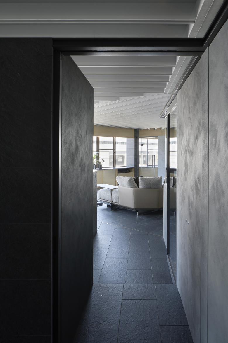 The above actions created a space that satisfies openness, continuity, and daylight control. In addition, as has been the practice in previous house renovations, the ceilings between the rooms are made continuous by using glass between the railing above the fixtures, and the ceiling surfaces of the partition walls are also made of glass, creating a state of connection despite the partitioning. The bathroom is protected by the inner terrace in the foreground, where one can enjoy the view of the mountain range. In the bedroom, the glass from the waist wall up connects the living room with the view of the mountains beyond.