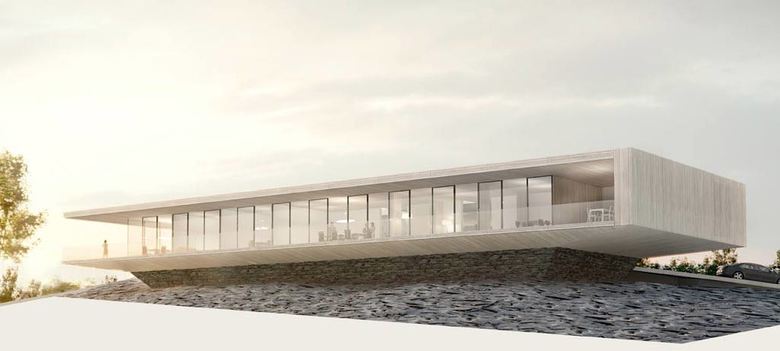 Auf der Spitze der Liegenschaft platziert, erhebt sich ein langgestreckter, schlichter, quaderförmiger Baukörper über einem aus Schieferstein errichteten Sockelgeschoß. Das Objekt schwebt über dem nach Süden hin abfallenden Gelände. Vorfahrt und Empfang sind großzügig gestaltet und ermöglichen einfache Orientierung. Die Vorfahrt weitet den Straßenraum im Bereich des Wendehammers auf und gewährleistet somit die Sicht auf den Wald auch für die Anrainer. Die Nachbargebäude werden kaum überragt, repräsentative Qualitäten eröffnen sich nach und nach wenn man sich dem Gebäude nähert. Zum angrenzenden Wald orientieren sich uneinsehbare private Terrassen und Freiflächen.