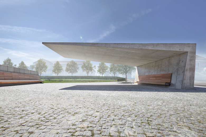 Bei einer Größe von 80 m2 und einer Auskragung von 12 m handelt es sich vermutlich um eine der größten Konstruktionen dieser Art in Österreich. Das gesamte Bauwerk ist in Sichtbeton ohne zusätzliche Verblechungen errichtet und stellt das Bindeglied zwischen der formelleren Platzzone des Kirchenplatzes und dem Teich her. Dieser weist durch das neu errichtete Holzdeck eine hohe Aufenthalts- und Naherholungsqualität auf.