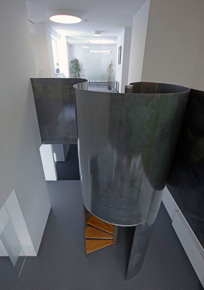 Im Eckhaus an der Kreuzung Frauenstraße/Schuhhausgasse entstand auf zwei Geschossen eine auf wenige Elemente reduzierte Arbeitswelt. Um eine möglichst freie und offene Kommunikation zwischen beiden Geschossen zu schaffen wurde ein großzügiger, rund 7 Meter hoher Luftraum integriert. Die Verbindung der beiden Ebenen erfolgt über eine Spindeltreppe, die von einer Tonne aus geöltem Schwarzblech gefasst wird. Die Freifrom stellt das zentrale Element der Arbeitswelt da. Die profillosen Glastrennelemente in den Büros sorgen für Lichtdurchflutung und die notwendige Transparenz. Die Transparenz und die weißgestrichenen Wände stehen im deutlichen Kontrast zu der in Anthrazit gehaltenen Treppe, dem Bodenbelag und dem in schwarz gestaltetem mobilen Raumteiler.