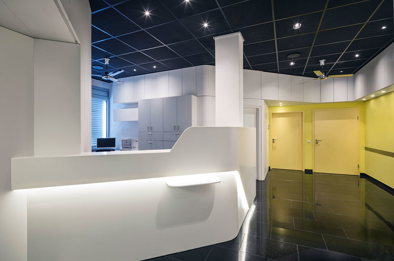 Ausschlaggebend für die Gestaltung der Räumlichkeiten waren hochwertige Hygienestandards sowie ein für eine Arztpraxis erforderliche klare und aufgeräumt wirkende Typologie. Das zentrale Element der chirurgischen Praxis ist eine maßgefertigte und individuell gestaltete Theke, die im Rahmen des hoch effizienten Betriebs in den Praxisräumlichkeiten den Patienten als Anlaufstelle dient. Die Farben Schwarz, repräsentiert durch geschliffenen schwarzen Granit, einem Nero Assoluto, und Weiß organisieren die Gestaltung des Raums. Die Farben versinnbildlichen den hohen Hygienestandard und strahlen Professionalität aus. Zusätzlich schafft die Gestaltung auf diese Weise Vertrauen unter den Patienten.