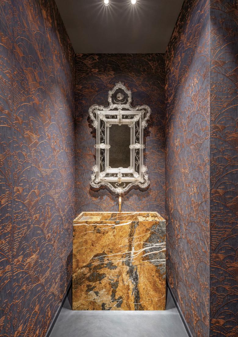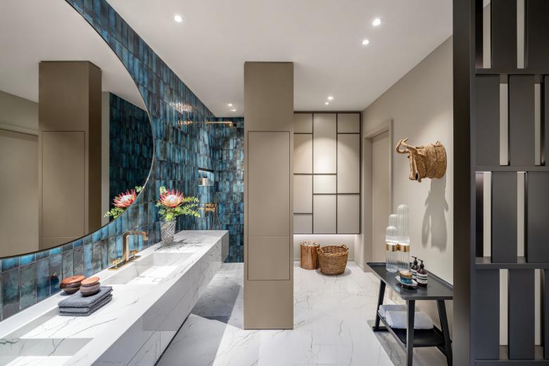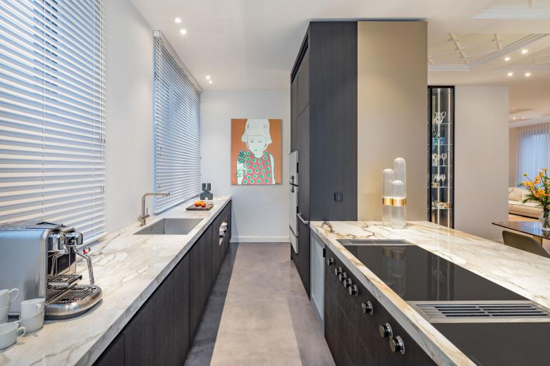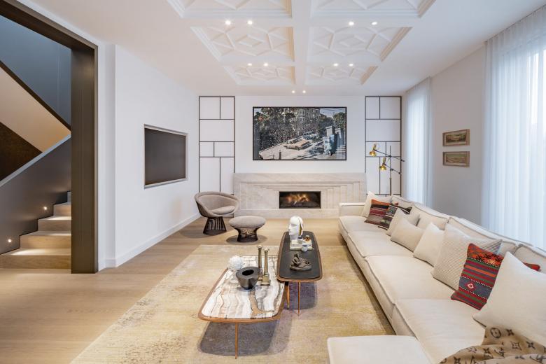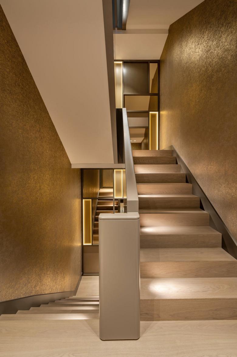 Ein edles Townhouse im Frankfurter Diplomatenviertel wurde von Hollin+Radoske vom Rohbau an individuell geplant und in enger Abstimmung mit den Kunden in eine ungewöhnliche High-End Residenz verwandelt. Auf fünf Ebenen verteilen sich die unterschiedlichen Bereiche vom Gästeappartement, über die Eingangshalle, den Privaträumen, der Wohnebene bis hinauf zur spektakulären Dachterrasse mit Skylineblick, üppigem Grün, verschiedenen Sitzbereichen und dem Jacuzzi-Pool. Hollin+Radoske entwickelte eine durchgehende Designphilosophie. Die vorherrschenden Elemente weißer Marmor, Gold und darauf abgestimmte, umfangreiche Einbauten, führen zu einem harmonischen und vor allem auch persönlichen Gesamtkonzept.