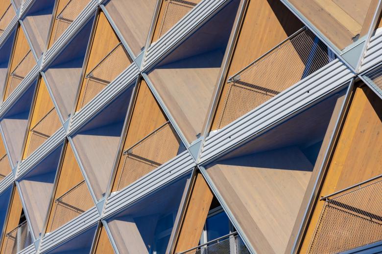 Das zirkuläre Bauen beruht auf der Idee, dass möglichst keine Rohstoffe weggeworfen werden, sondern dass alles Verbaute in immer neuen Kreisläufen wiederverwendet werden kann. Im Sinne des Cradle-to-Cradle®-Prinzips agiert The Cradle so als Materiallager und stellt sich in seiner Konzeption damit als besonders zukunftsfähig dar. Denn alle eingebauten Materialien wurden hinsichtlich Materialgesundheit, Schadstofffreiheit und späterer Demontagefähigkeit der einzelnen Komponenten geprüft. Die rautenförmige Holzfassade ist aus dem Ort heraus entwickelt und verbindet durch sein Design integral Tragwerk, Sonnenschutz und auch Loggien. Weiterhin ist die Fassade Ausdruck der Kreislauffähigkeit, denn die elementierten V-Stützen aus Lärchenholz folgen dem Konzept „Design für Disassembly“. Insgesamt wurden 2.150 m3 Holz aus zertifiziert nachhaltiger europäischer, größtenteils deutscher Forstwirtschaft verbaut. Holz als nachwachsendes Material ersetzt dort, wo möglich, den umweltschädlichen Baustoff Beton, speichert Kohlenstoff und verbessert dadurch den C02-Fußabdruck des Gebäudes.