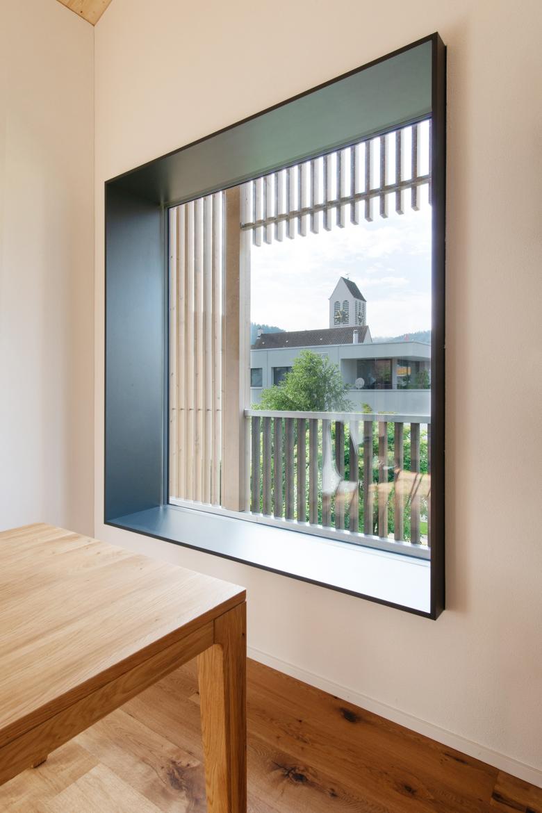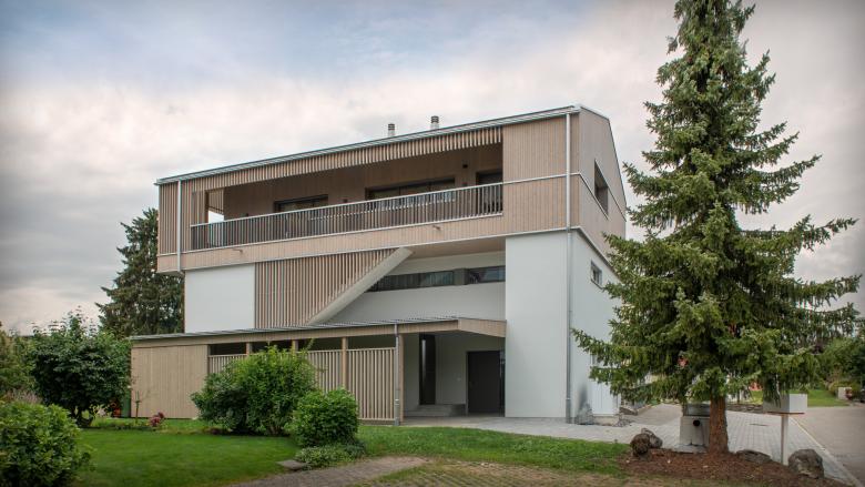 Bewusst soll die hybride Bauweise, das heisst der Bestand in Massivbau und die Aufstockung in Holzbau, erlebbar gemacht werden. Zugleich verbindet der vertikale Holzfilter beim Treppenlauf gemeinsam mit dem überdachten Carport die Fassade zu einem stimmigen Ganzen. Das architektonische Konzept ist eine moderne Interpretation der im Schweizer Mittelland verbreiteten Bauernhaustypologie mit den aussenliegenden Treppen und Veranden.