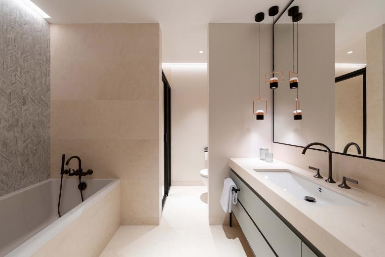 The light natural stone floor made of Crema d'Orcia limestone extends from the corridors into the bathrooms, where the harmonious world of colors continues on the walls, and individual accents are set by glass mosaics. Bronze-colored fittings enhance the wellness-like oases.