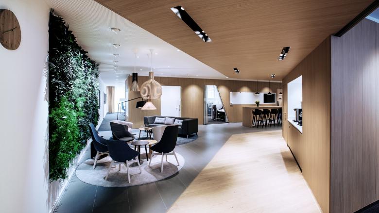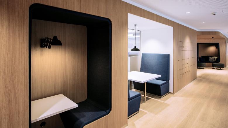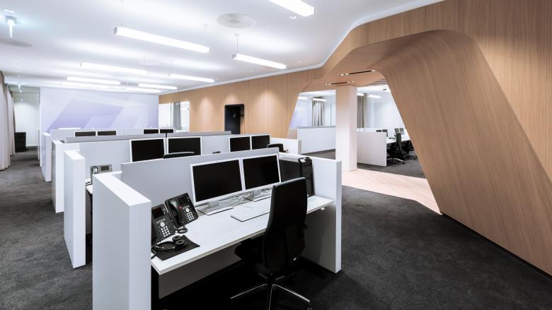 Der »Connecting Core« definiert zwei funktionale Bereiche: Im »Customer Advisory« befinden sich Shared Desk-Arbeitsplätze mit CI-konformen Videorückwänden, die den Raum zusätzlich strukturieren. Der Bereich »Social Hub« lädt die Mitarbeiter mit inspirierender Atmosphäre und gemütlichen Sitzgelegenheiten ein, sich auszutauschen und zu erholen.