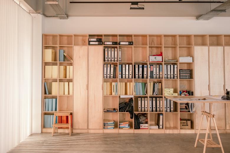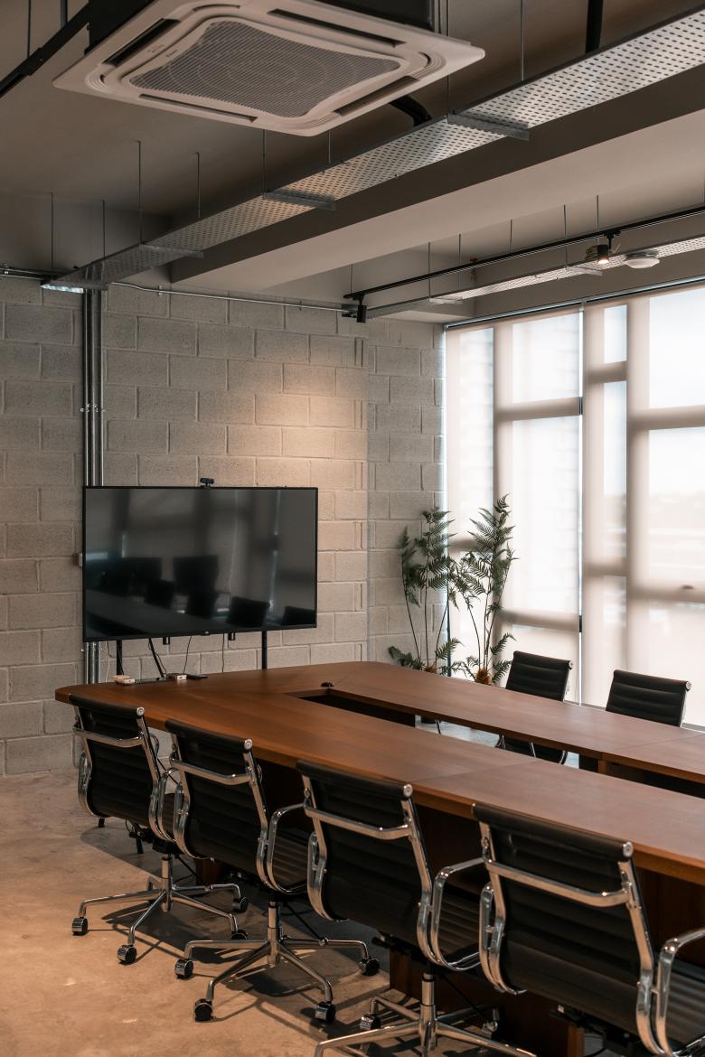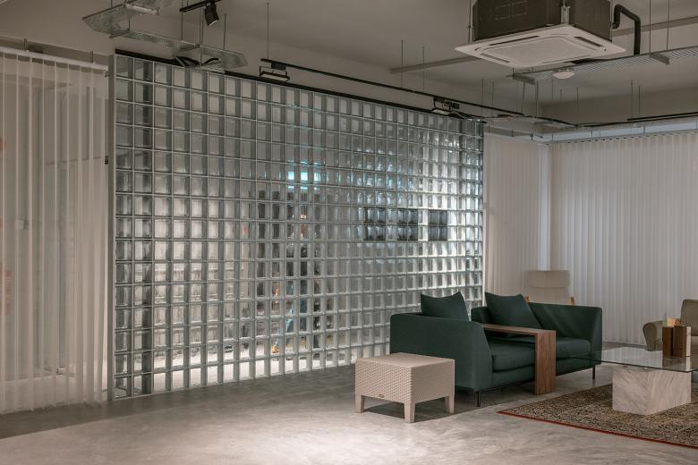 Beim Betreten des Gebäudes bietet sich dem Besucher ein beeindruckender Anblick: eine lichtdurchflutete zentrale Halle, flankiert von großen Glaswänden, die einen Panoramablick auf die umliegende Skyline ermöglichen. Die Innenwände sind mit einer komplexen Anordnung von Glasbausteinen verkleidet, die strategisch so positioniert sind, dass natürliches Licht in den Innenraum fällt und den rohen Zementboden darunter sanft erhellt. Gleichzeitig gliedern die schlanken Trennwände aus Glasbausteinen die offenen Arbeitsbereiche und ihre unterschiedlichen Nutzungen. Das Designethos des Büros wird durch die Betonung industrieller Elemente definiert, die sich in den freiliegenden Rohren und Wannen aus verzinktem Eisen manifestieren, die wie abstrakte Skulpturen die Decke durchziehen. Diese robusten und doch eleganten Akzente dienen als visuelle Erinnerung an die ursprüngliche Einheit des Gebäudes und verleihen der zeitgenössischen Ästhetik ein Gefühl von Authentizität und Tiefe. In den dunkleren Bürobereichen, in denen das Tageslicht weniger zur Verfügung steht, fallen zarte Vorhänge von der Decke bis zum Boden und erzeugen ein Spiel aus Schatten und Lichtdurchlässigkeit, das dem Raum eine geheimnisvolle und intime Atmosphäre verleiht. Hier können sich die Mitarbeiter in private Enklaven zurückziehen, um konzentriert zu arbeiten oder Brainstorming-Sitzungen abzuhalten, eingehüllt in einen Kokon aus sanftem Licht. Wenn der Tag zur Nacht wird, verwandelt sich das Büro erneut. Dynamische Lichtinstallationen schaffen eine warme, einladende Atmosphäre, in der die verwendeten Materialien neue Muster und Reflexionen erzeugen.