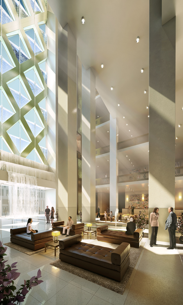 Wie im traditionellen Haustypus erfolgen in dem „Tower of Falling Water“ die Haupterschließungen vom Hof aus, abgeschirmt von den Hauptstrassen. Aus der vorhandenen Geometrie des Grundstücks wurde eine Struktur entwickelt. Wie auf Schnittmusterlinien werden die verschiedenen Volumina geformt. Die unterschiedlich abgestuften Baukörper sind durch das geometrische Grundgerüst miteinander wie in einem dreidimensionalem Ornament verbunden. Einige islamische Architekturelemente sind im Entwurf wieder zu erkennen: In der Mandara, der großen Eingangshalle des Hotels, befindet sich im Zentrum die Durka´a mit der im Boden eingelassenen Wasserfläche. Die rautenförmige Gitterstruktur der Fassaden erinnert an the grating of a Mashrageja.