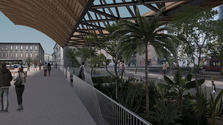 Al centro della piazza urbana coperta è previsto un parco-giardino, attorno al quale si svolge il traffico di scambio verso l’area pedonale. Come un vaso di fiori in un salotto, il giardino diventa punto di riferimento. Il parco-giardino è previsto con una fitta piantagione variata, una selva. Questo Eden, un mondo di flora subtropicale comprendente palme, camelie, glicini, oleandri, canfori, eucalipti, magnolie, azalee, arance, limoni, bambù e qualche specie di piante fiorifere odorose vuole attrarre ed incantare i passanti.