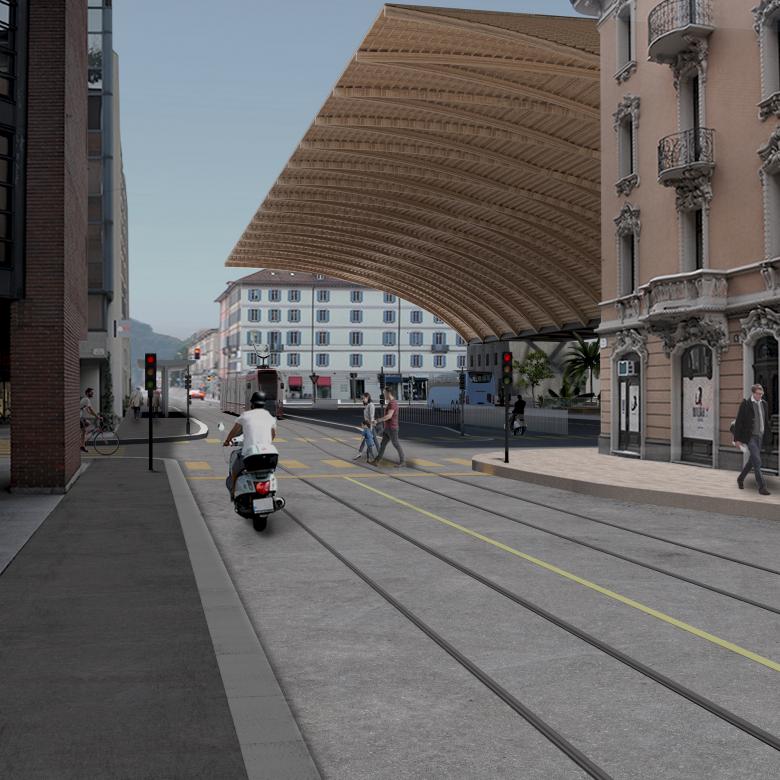 La piazza è definita da una copertura di forma parabolica aggettante che sfrutta al massimo l’estensione e l’altezza, creando uno spazio di riferimento unico, a partire dall’isola verde al suo centro. Attorno al giardino centrale vi è un ampio spazio di circolazione pedonale che può cogliere su una superficie di 900 m2 varie attività quale mercato coperto, funzioni commerciali ecc. Perimetralmente sono disposte le fermate dei bus secondo il principio della rotatoria, raggiungibili dall’accesso al posteggio e tra di loro senza attraversamenti. All’estremo nord, la copertura coglie la fermata del tram-treno. Il posteggio delle biciclette e dei motocicli è disposto in modo lineare al di sotto della piazza, raggiungibile da due rampe situate sul lato nord, con un minimo di attraversamenti rispetto all’area di circolazione dei bus e all’area pedonale. Dal posteggio si accede alla piazza dal vuoto centrale che è punto di riferimento e di luce naturale.