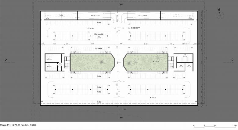La copertura si appoggia su due volumi edili che contengono le funzioni richieste, su tre livelli (biglietteria TPL e ARL, polizia comunale, spazi commerciali …). Il vuoto centrale permette una relazione verticale tra gli elementi.