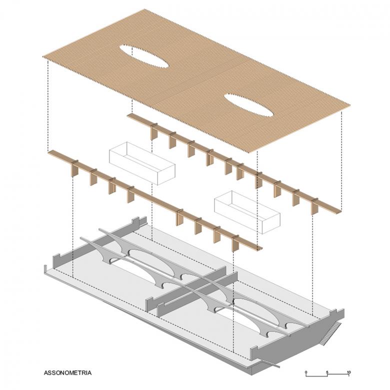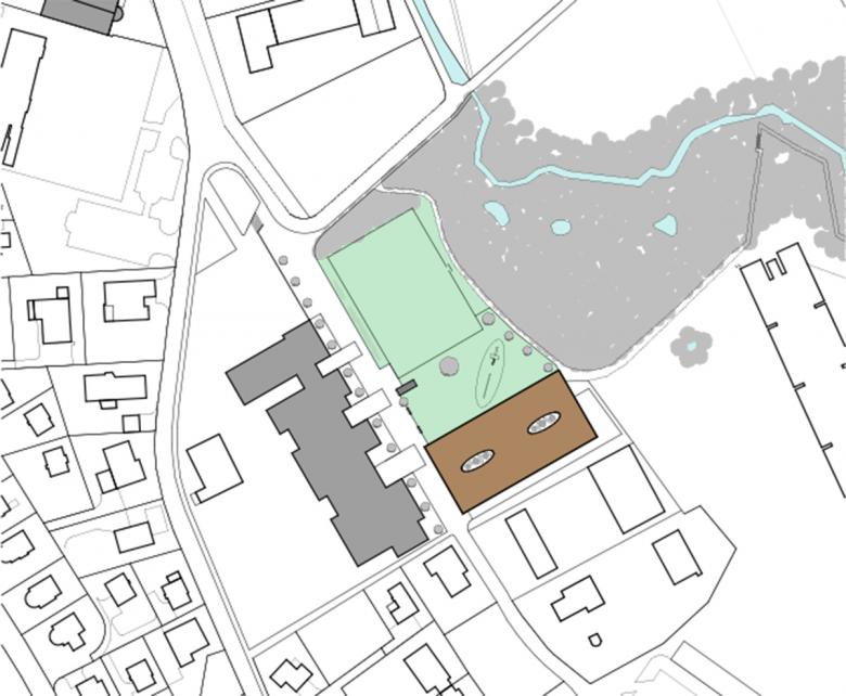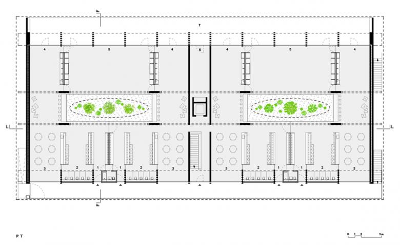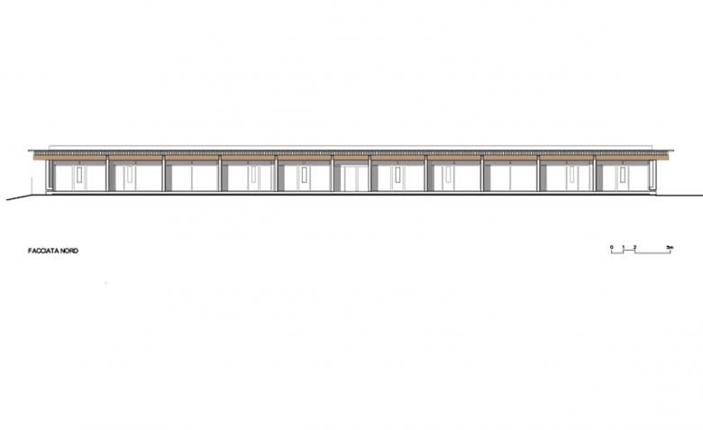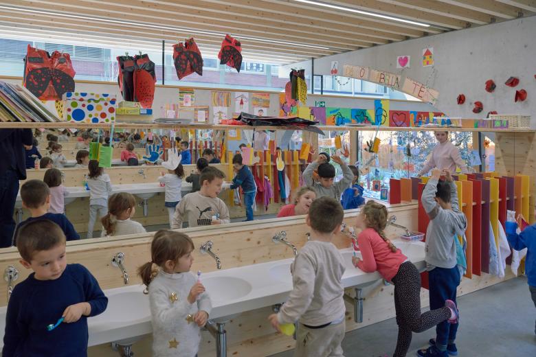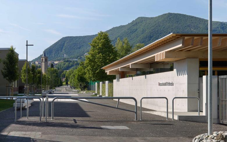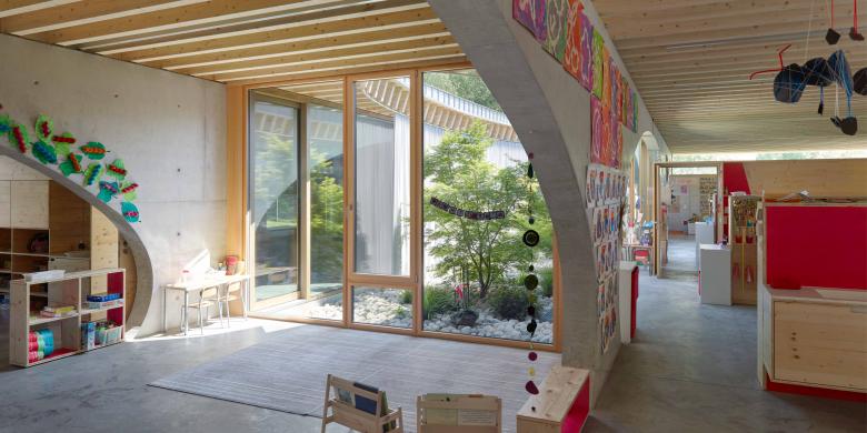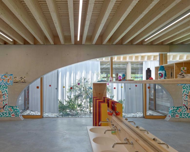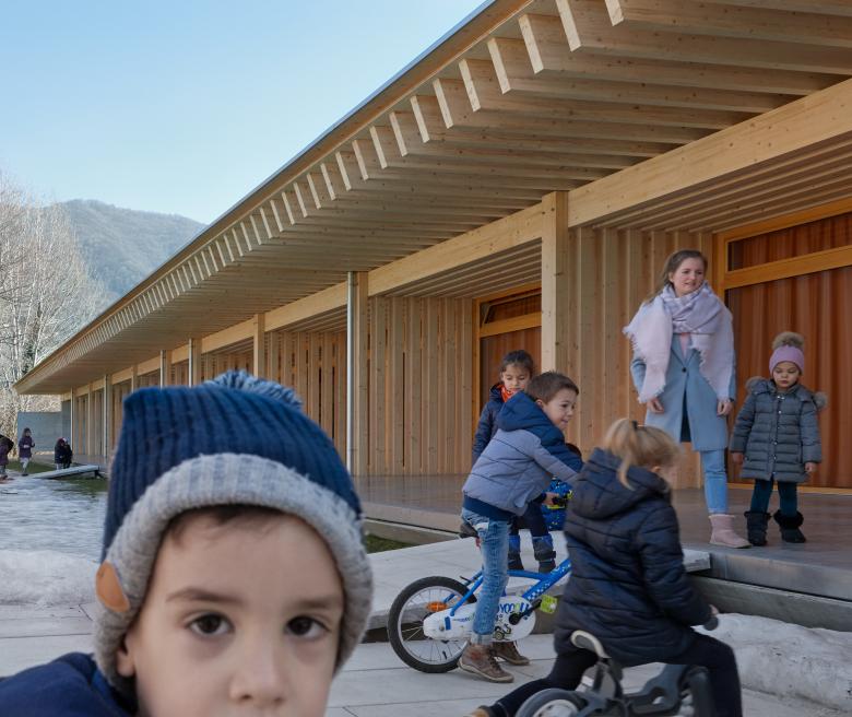 L’edificio definisce con un grande tetto, una lastra orizzontale, il limite sud di un terrapieno rettangolare, posizionandosi tra la scuola elementare, un’area boschiva con biotopo e la scuola media, in modo di mantenere libera la parte nord, quale spazio di riferimento. Le 4 sezioni sono disposte su un piano unico, suddivise in due comparti di due sezioni. Al centro dei comparti si trova un patio vetrato: un’apertura ellittica verso il cielo, un giardino, quale elemento di divisorio e di riferimento, attorno al quale si svolgono le varie attività. Gli spazi di supporto sono collocati al piano inferiore. Il sistema costruttivo è composto da un basamento in cemento armato e da una grande copertura in legno, composta da una serie di travetti, appoggiati sui 4 assi strutturali longitudinali. Essi sono composti da due muri arcati in cemento armato centrali e travi composte in legno laterali che formano delle nicchie verso i ballatoi.