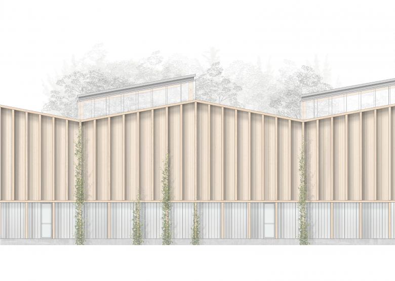 Der Baukörper ist funktional und ästhetisch durchdacht, mit einer strukturierten Vertikalisierung und differenzierten Hallenteile. Die strenge Geometrie der Oberlichtlaternen in Kombination mit der klar gegliederten Holzfassade verleiht dem großen Gebäude Maßstab, Orientierung und eine eigene Identität. Die nachhaltige Materialwahl aus Holz, Beton und Glas sorgt für eine ressourcenschonende Bauweise und eine angenehme Arbeitsatmosphäre. Eine weitere Besonderheit unseres Entwurfs ist der hohe Vorfertigungsgrad, der eine schnelle und effiziente Bauzeit ermöglichen würde.