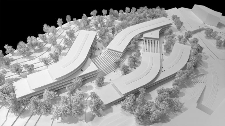 Der Universitätscampus der neuen IT:U Linz ist als architektonisch zeichenhaftes Gebäudeensemble konzipiert, das sich schlüssig in den umgebenden Kontext einfügt und diesen selbstbewusst weiterentwickelt. Die Identitätsstiftung erfolgt durch ein fließendes Gebäude mit Bezug zur Landschaft und ein vernetztes Bauwerk, das sich auf den Inhalt als „gebautes Netzwerk“ oder „gebaute Datenströme“ bezieht. Der Entwurfsansatz nimmt Bezug auf die Topografie des Grundstücks und konzipiert die Gebäude als topographische Schichten. Die spezifische, ortsprägende Charakteristik der Landschaft des beginnenden Mühlviertels wird für den Entwurf herangezogen und die Gebäudestruktur als artifizielle fließende Landschaft konzipiert: Die Baukörper bilden in ihren Hauptausrichtungen gebaute Höhenschichtlinien und fügen sich so ideal in das Grundstück ein.