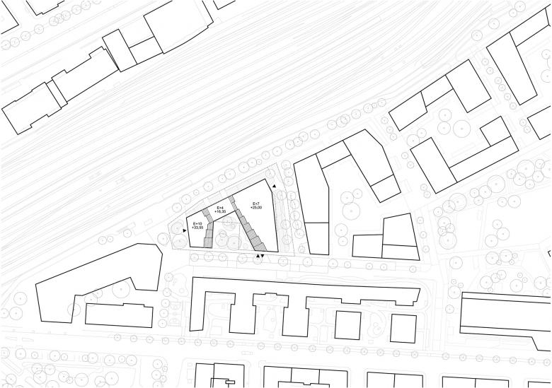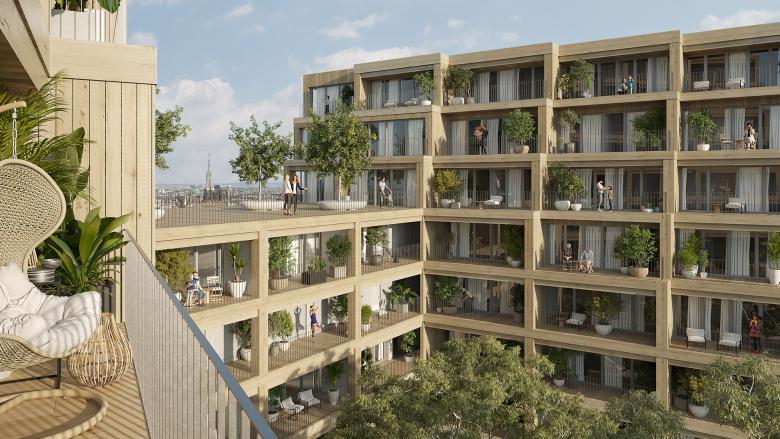 Mit dem Wohnbau ÖBB Neues Landgut soll ein einheitliches, identitätsstiftendes Ensemble zweier miteinander verbundener Volumen um einen Hof etabliert werden, das einerseits in die Umgebung eingebettet liegt, andererseits aber auch starke wohnbezogene Qualitäten aufweist, um zukünftigen BewohnerInnen ein gutes Leben zu ermöglichen. Durch den Grundrisszuschnitt und durch die hofseitig nach oben rückspringende Abtreppung der Baukörper entsteht eine Geste der Öffnung nach Süden und eine Geste der Öffnung nach oben. Die Öffnung nach Süden ermöglicht eine Einbindung des Wohnensembles in das umgebende Umfeld. Die Öffnung nach oben führt zu qualitativ hochwertigem natürlichen Lichteintrag in die unteren Bereiche und in den Hof und damit zu einer hohen Aufenthaltsqualität des Hoffreibereichs.