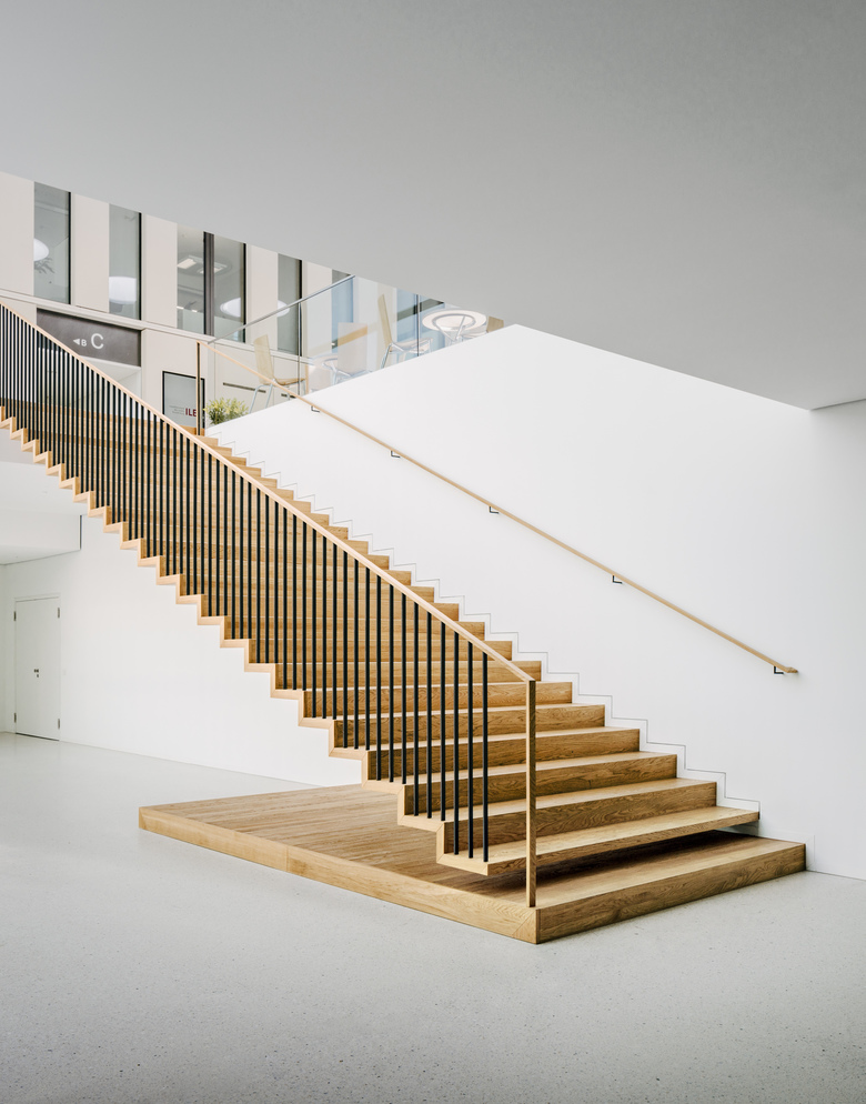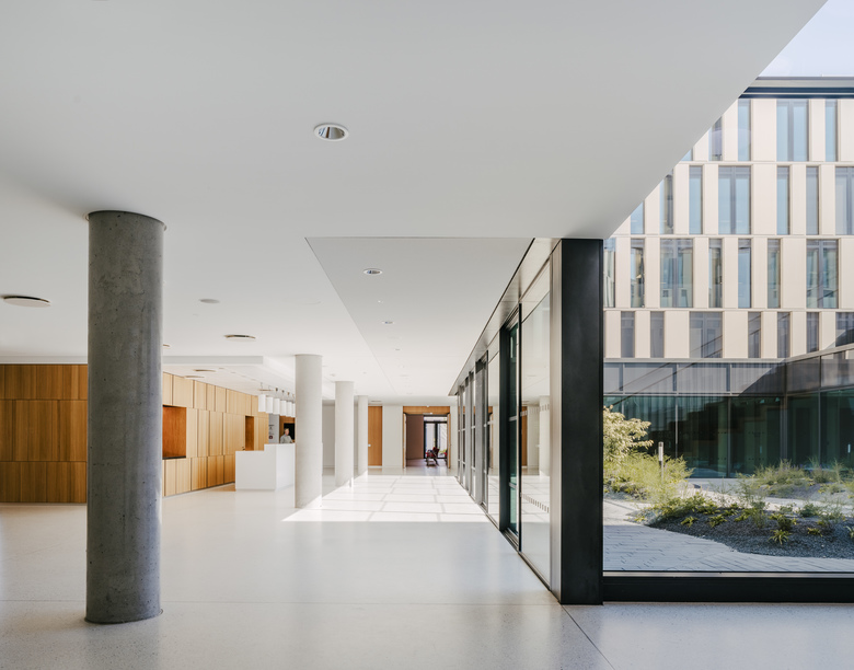 Der Entwurf für den Neubau der Investitionsbank des Landes Brandenburg ILB in Potsdam ist in drei Gebäudevolumen gegliedert, die über eine zweigeschossige Eingangshalle miteinander verbunden sind. Die drei Bauteile verfügen jeweils über einen Innenhof, der sich an einer Seite zur Landschaft hin öffnet. Das „Auengeschoss“ bildet als Sockelgeschoss die Basis für die drei Pavillons und beherbergt kommunikative Nutzungen wie Besprechungsräume, Mitarbeiter-Restaurant und Cafeteria.