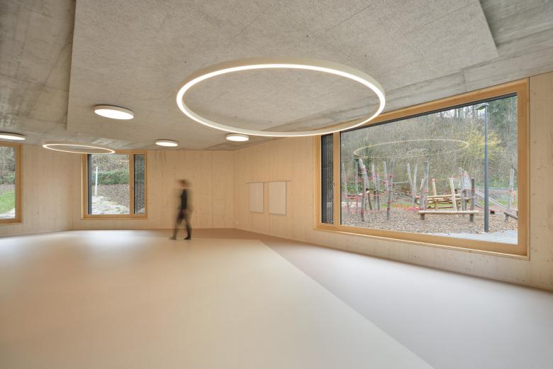 Der Grundriss ist unterteilt in vier Pentagon-/Hexagonvolumen, gruppiert um einen gemeinsam genutzten Eingangs- und Erschliessungbereich. In zwei der Volumen sind jeweils die Kindergärten respektive Krippengruppen untergebracht, in den beiden anderen befinden sich die Büro-/Mitarbeiterbereiche und die Essräume. Die Einheiten der Kindergärten und der Krippen sind in Ihrer Dimension identisch, um bei einer späteren Bedarfsänderung flexibel reagieren zu können. Die Haupträume in jeder Gruppe orientieren sich jeweils nach Süden und Westen. Durch die grosszügigen Fensteröffnungen entstehen abwechslungsreiche Ein-/Ausblicke in die angrenzende Natur.