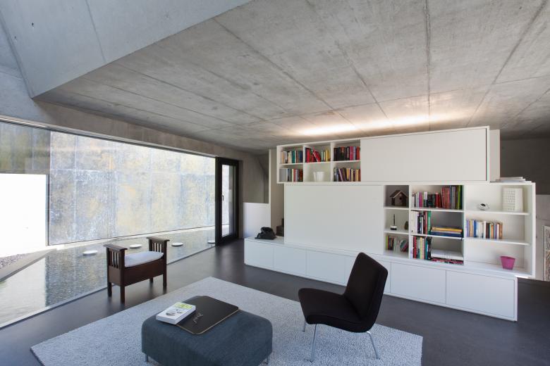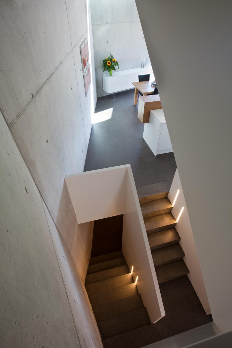 In einer ländlichen Umgebung entstanden zwei freistehende Einfamilienhäuser, die in Volumen und räumlicher Anordnung neue Wege gehen. Der Grundtyp des Doppelhauses wurde skulptural bearbeitet und in polygonale Körper transformiert, die durch Wasserbecken, Spiegelungen und Durchblicke miteinander interagieren und eine besondere Intimität schaffen. Das Erschließungskonzept im Split-Level-Verfahren nutzt den Hangverlauf und prägt die Raumaufteilung, während die Materialwahl – Sichtbeton, feine Putzwände und große Fensterflächen – eine technisch-kühle Ästhetik vermittelt. Die Oberlichter erzeugen sakrale Lichtstimmungen im Innenraum, die dem Gebäude eine besondere Ausstrahlung verleihen. In Zusammenarbeit mit dem Künstler Thomas Sonderegger wurde die Fassade und das Dach aus einzigartig bearbeitetem verzinktem Stahl entwickelt, was dem Gebäude eine monolithische, skulpturale Präsenz verleiht.