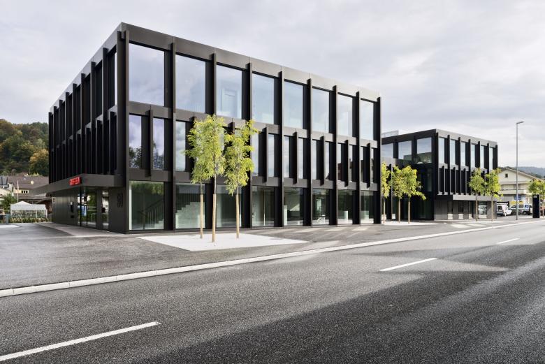 Drei mit Körnung und Geometrie des Quartiers korrespondierende Gebäudekuben verschmelzen zu einer doppelköpfigen Figur. Ein baumbestandener Aussenraum verzahnt sich mit dem Baukörper und weitet sich an der Strassenkreuzung zum Platz. Die Elemente der schwarzbraun schimmernden Aluminiumfassade sind zu einem sorgfältig proportionierten, monochromen Relief gefügt. Tageslicht fällt durch eine Glasdecke in die hohe, mit Ulmenholz verkleidete Kundenhalle und bringt den weissen Marmorboden zum Leuchten.