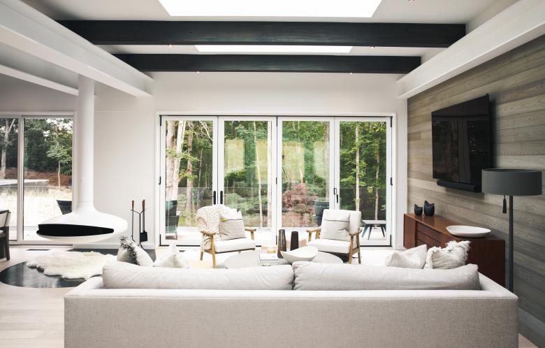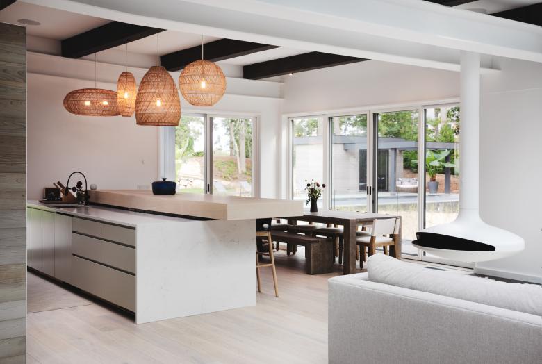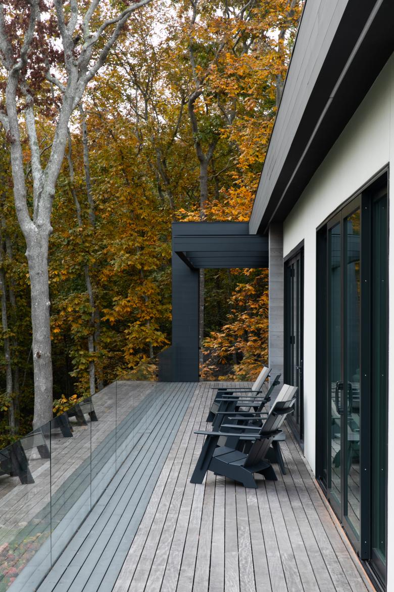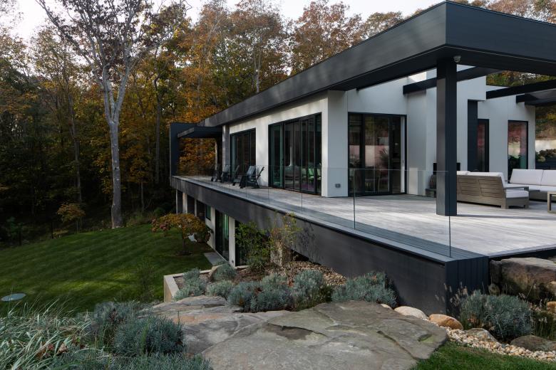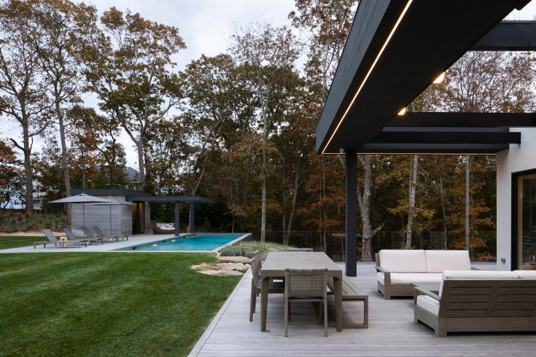 Engineered and natural materials create a plateau allowing for indoor and outdoor spaces to come together in a natural rhythm, blending public and private living. Nestled into the hillside, the private lower-level slips into the landscape, where one can view the fern forest. Above, a raised infinity pool carves into the earth. Tying the two levels together is a material palette of shou sugi ban, dark metal, glass, exposed concrete, and fine stucco. Deftly layered, they help to create a synthesized composition and form.