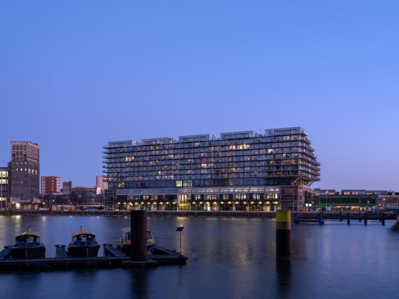 The facade of the volume consists of industrial frames with glazed panels set between them. The repetition of these so-called ‘muse frames’ creates an industrial look with a dockland character. The interior of the volume, by contrast, is an oasis of plants and warm materials that extends across the interior deck and connects with the loft apartments.