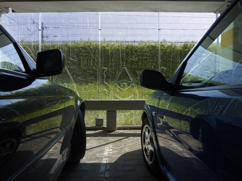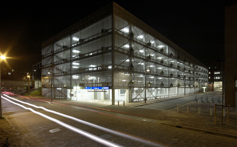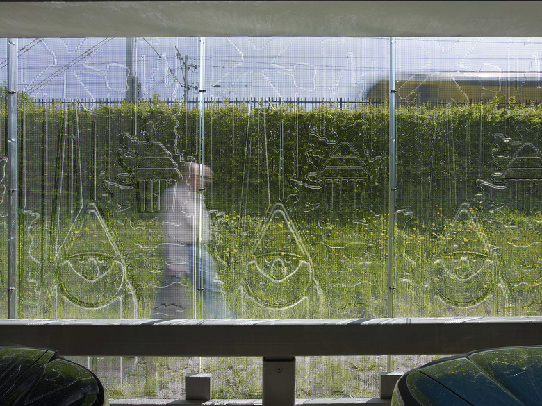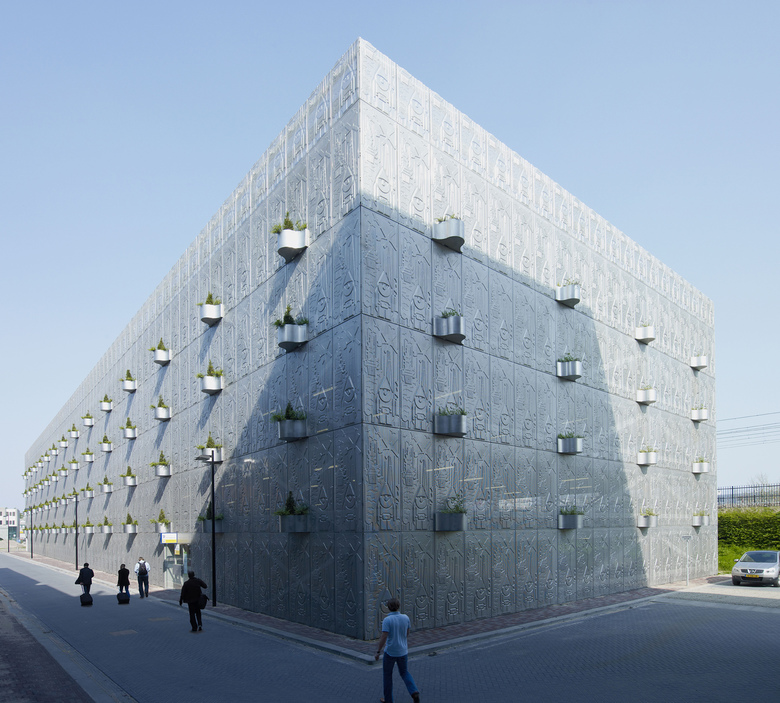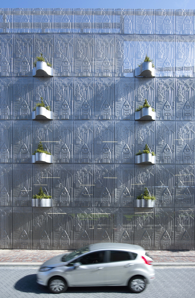 The special facade of the garage contains natural elements, like integrated plant containers with specific plants based on the orientation of the facade. By using a vacuum forming technique, commonly utilized in the automotive industry, the perforated facade panels show characteristic images of the province of Flevoland like birds, windmills, garden gnomes and bird houses. The surface relief created by the pressed figures on the panels lends the garage the appearance of a cheerful-looking giant tin can. Since the facade panels act as veils, the garage interior is flooded with daylight. This also creates a sense of community safety and pleasant natural ventilation in the garage. In the evening hours the facade acts as a luminous object that further enhances community safety in the immediate surroundings.