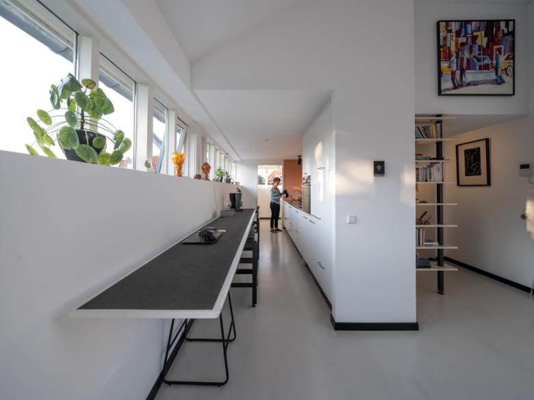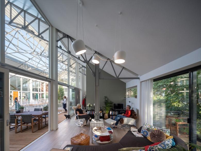 The loft houses in the Spaardersbad are all different due to their location around the pool. Except for two, the houses are accessed via wooden stairs and bridges that run above the swimming pool at the level of the first floor. All living areas are located on this floor. The high ceilings, which reach up to more than five meters, give the living space genuine loft quality. Moreover, the restored steel construction contributes to the atmosphere of living in a loft. The high transparent interior facades around the courtyard provide ample daylight in the homes. The sleeping areas are on the ground floor, adjacent to the garden and bottom of the pool. In the original tiled walls of the pool, small round window openings have been made to connect with the inner garden in the pool. All houses have a private veranda adjacent to the green inner garden and a private garden at ground level on the outer facade.