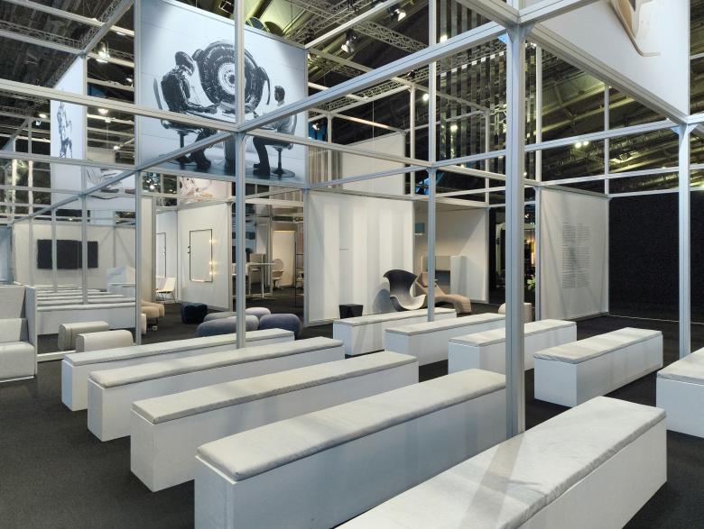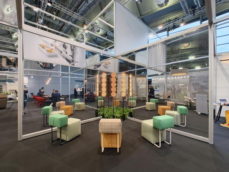 Die Gestaltung des Future-of-Work Areal verräumlicht die Herausforderungen der Orientierung in einer real-virtuellen Arbeitswirklichkeit. An einigen Stellen simulieren Dopplungen von Ausstellungsprodukten deren Realität und ihr virtuelles Abbild, an anderen Stellen vervielfältigen Spiegelstellungen ein einziges Produkt. Die Verzerrung von Wirklichkeiten wird durch Spiegelflächen thematisiert, die Flüchtigkeit virtueller Räume durch aufgelöste Wandflächen dargestellt. Insgesamt versucht