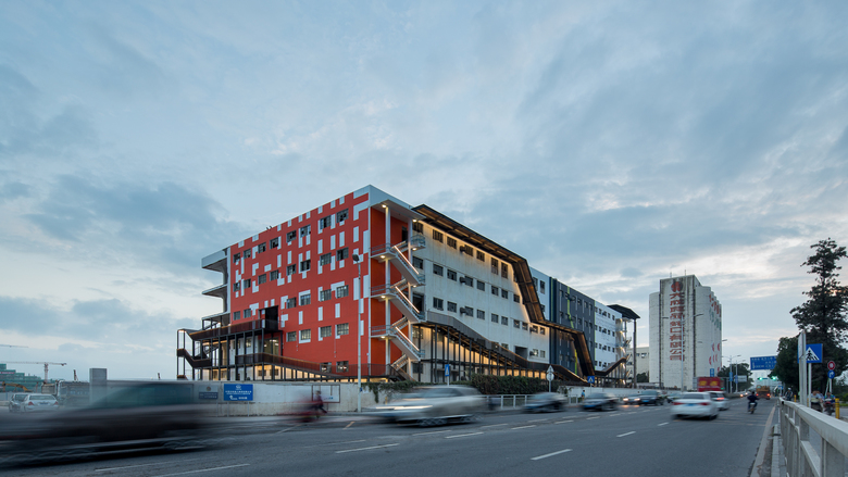 Meanwhile, as the space is renovated from storage into exhibition space, escape stairs have to be added to comply with the design codes. Besides, the stair ramp is enlarged to the maximum to create a continuous and complete visitor circulation in the whole façade along the city’s trunk road. This on one hand complies with the fire protection requirements, on the other hand creates impressive, dynamic and diverse façade out of the otherwise mediocre and monotonous impression.