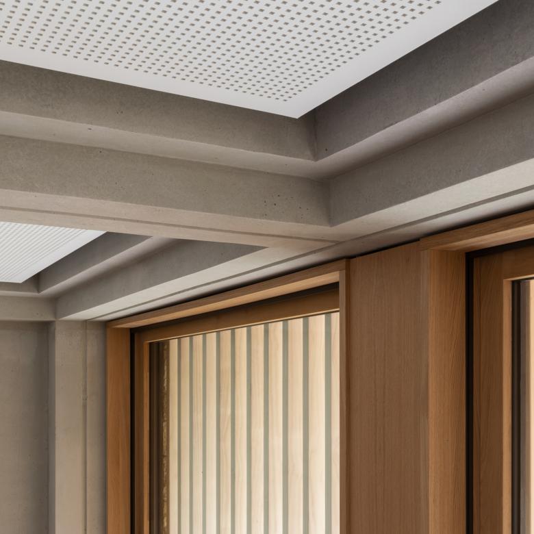 Vertikal aufgereihte Holzlamellen im Erd- und Obergeschoss, die in ihrer Anmutung metaphorisch an Buchseiten erinnern, schützen die Bibliotheksräume vor intensivem Sonnenlicht und Überhitzung, ohne den herausragenden Ausblick in die umgebenden Freiräume des Klostergartens sowie in Priors Garten zu verwehren.