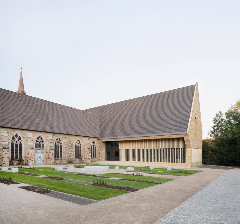Der Bibliotheksneubau des Predigerseminars wird als kompakte zweigeschossige Satteldachfigur entwickelt, die sich städtebaulich als logischer Baustein in das bestehende denkmalgeschützte Klostergefüge einfügt. Die Konturen der angrenzenden Bestandsgebäude werden übergangslos aufgenommen und weitergeführt, so dass trotz der modernen Prägung des Neubaus ein harmonisches Ganzes entsteht. Im Erdgeschoss bleibt die Gebäudeflucht zum Refektorium erhalten, während die Traufkante sich in den Garten vorschiebt. Der hierdurch entstehende Unterschnitt definiert den neuen Eingangsbereich der Bibliothek und sorgt gleichermaßen für eine sensible Überdachung der Treppen- und Rampenanlage, die sich als bauliches Element elegant mit dem Außengelände verschneidet und einen attraktiven Ort zum Verweilen sowie zum „Studieren im Garten“ entstehen lässt.
