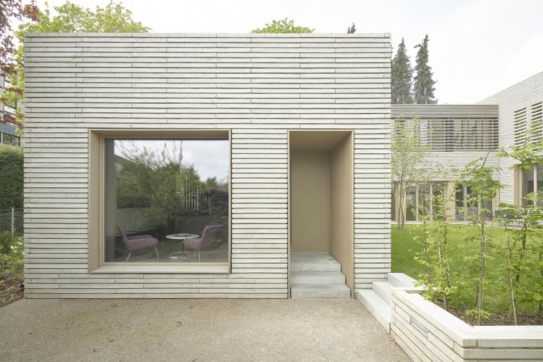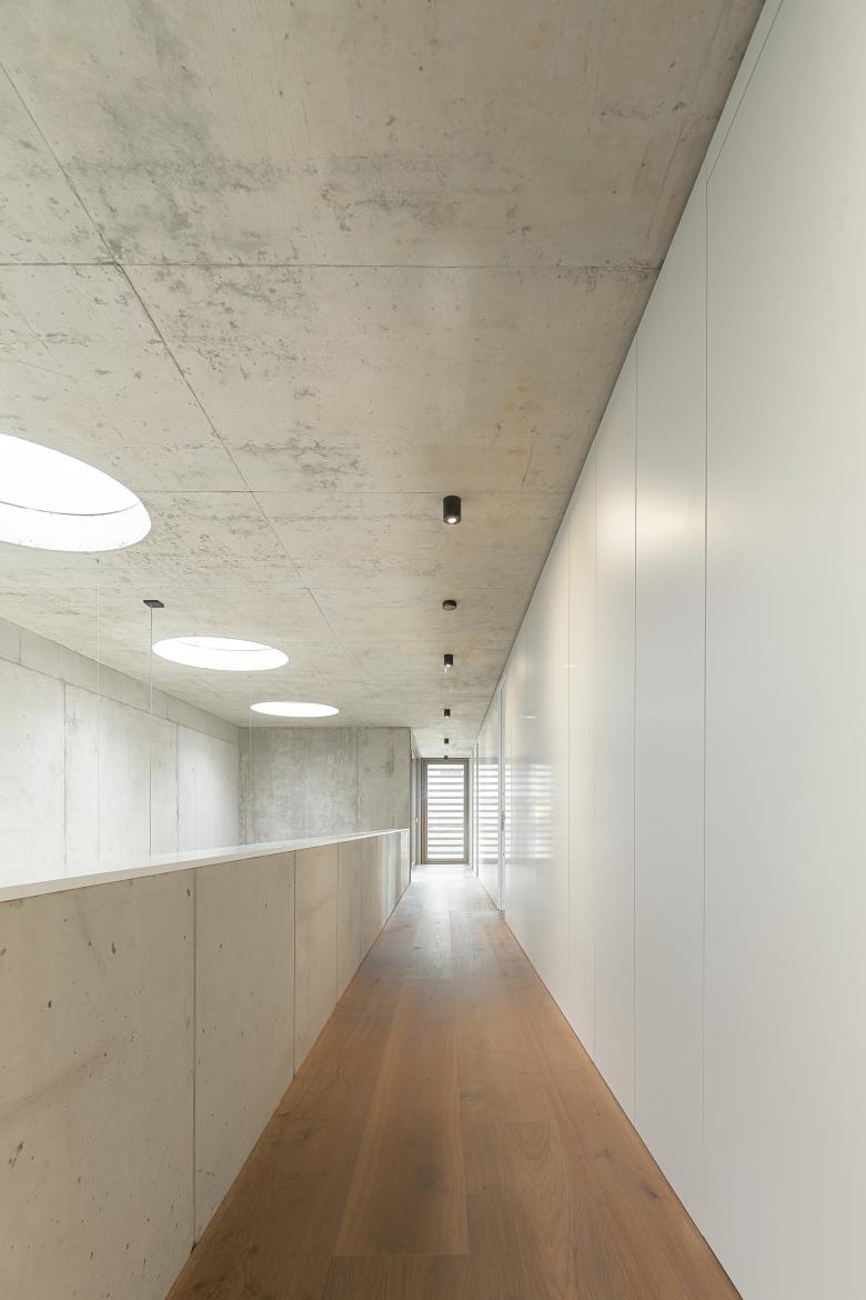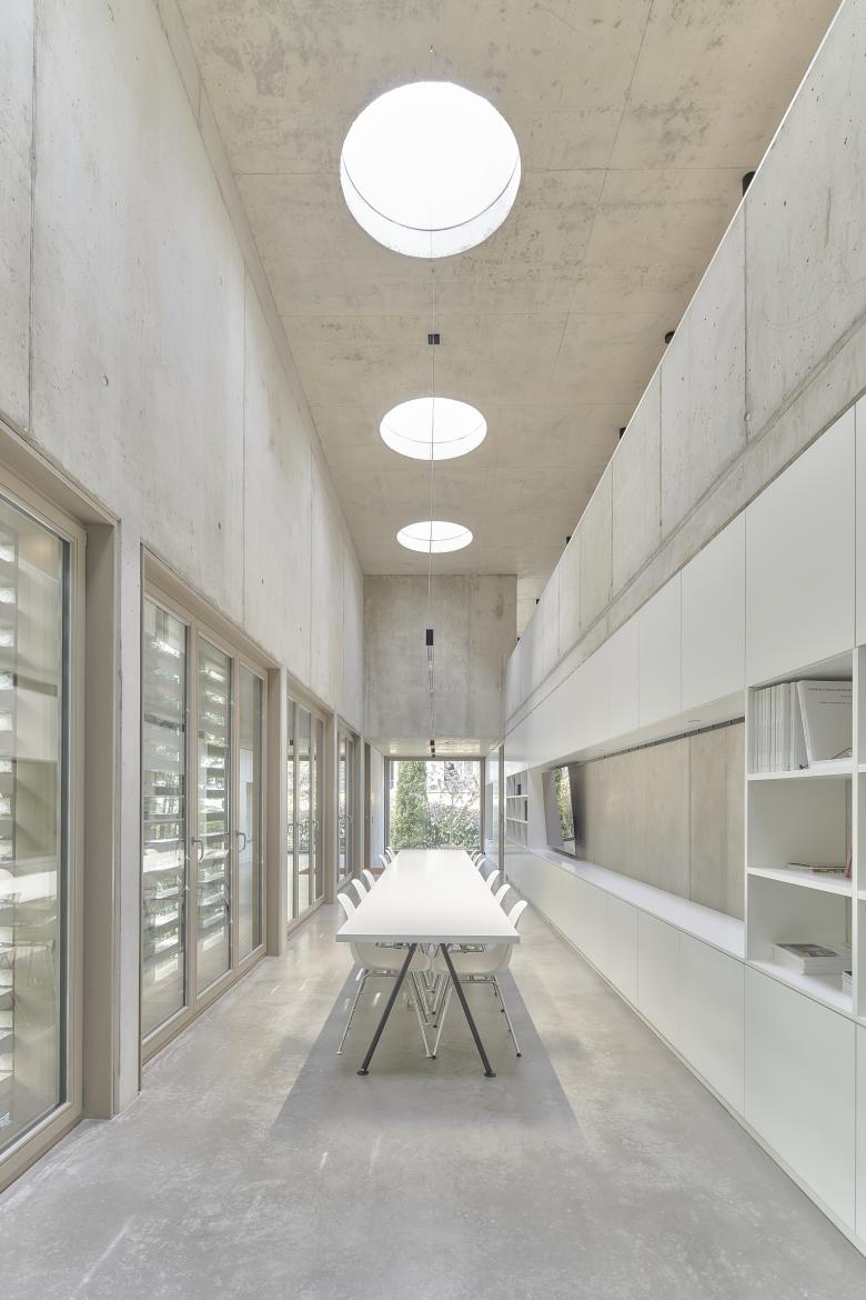 Großflächige, aus dem Fassadengefüge herausgearbeitete Perforationen, verleihen dem Gebäude nach außen eine bewusste Verschlossenheit, erzeugen im Inneren jedoch geborgene, teils kontemplativ anmutende Raumsequenzen.
